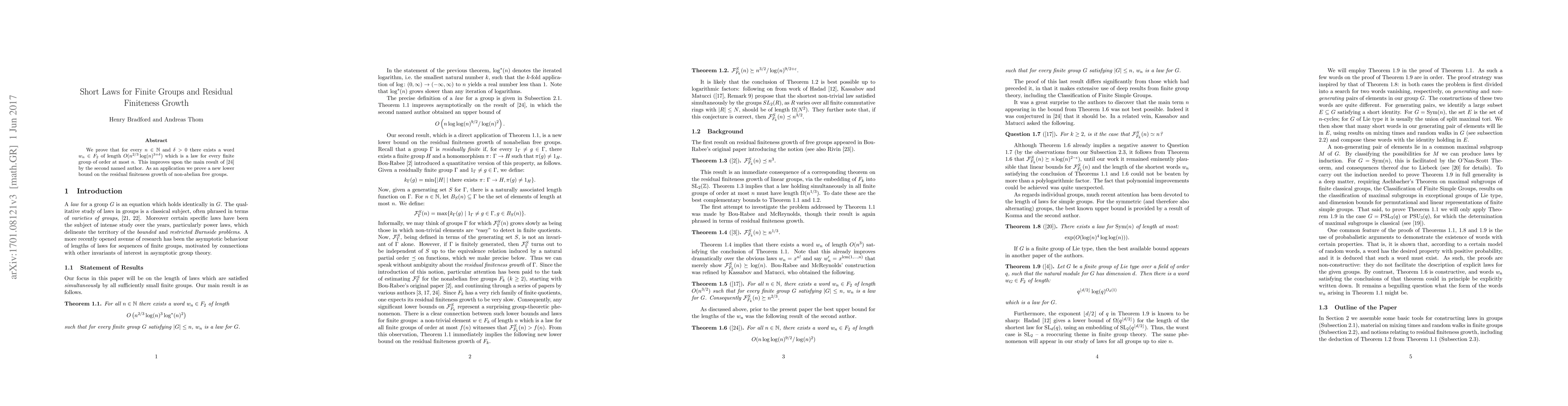 The paper establishes a new upper bound on the length of laws for finite groups, improving upon previous results, and applies this to derive a novel lower bound on the residual finiteness growth of non-abelian free groups.