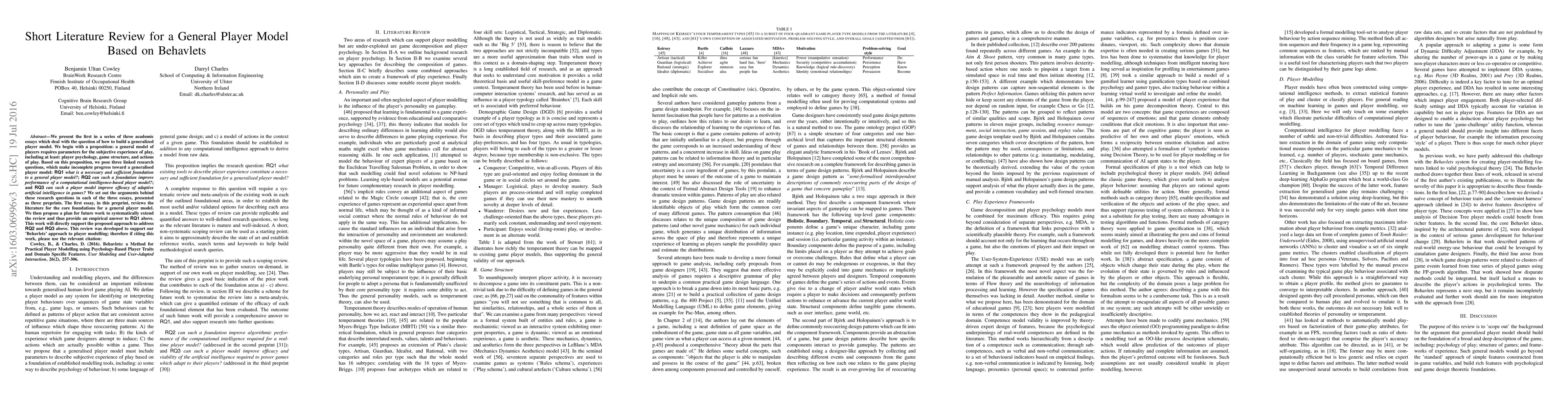 This literature review explores foundational elements for constructing a general player model, focusing on player psychology, game structure, and play actions. It sets the stage for future research on improving computational intelligence and adaptive AI in gaming through the proposed 'Behavlets' approach.