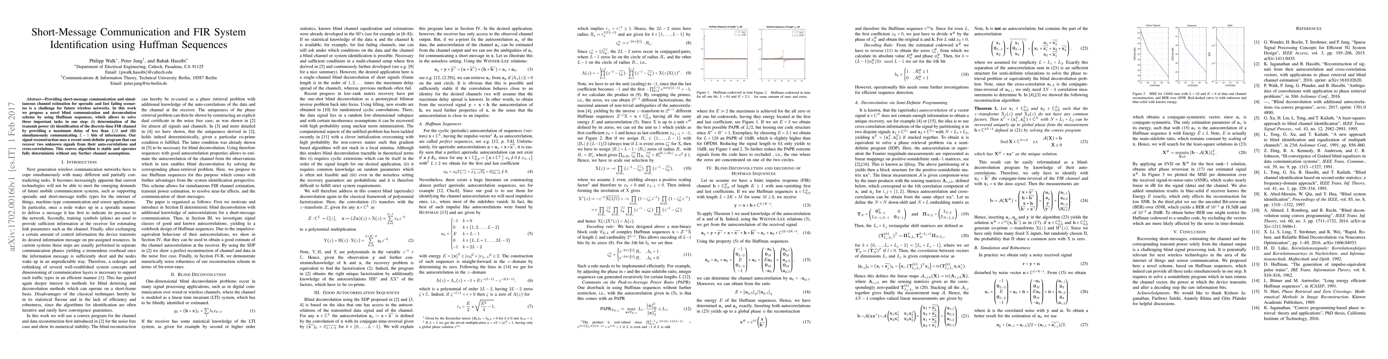 Providing short-message communication and simultaneous channel estimation for sporadic and fast fading scenarios is a challenge for future wireless networks. In this work we propose a novel blind communication and deconvolution scheme by using Huffman sequences, which allows to solve three important tasks in one step: (i) determination of the transmit power (ii) identification of the discrete-time FIR channel by providing a maximum delay of less than $L/2$ and (iii) simultaneously communicating $L-1$ bits of information. Our signal reconstruction uses a recent semi-definite program that can recover two unknown signals from their auto-correlations and cross-correlations. This convex algorithm is stable and operates fully deterministic without any further channel assumptions.