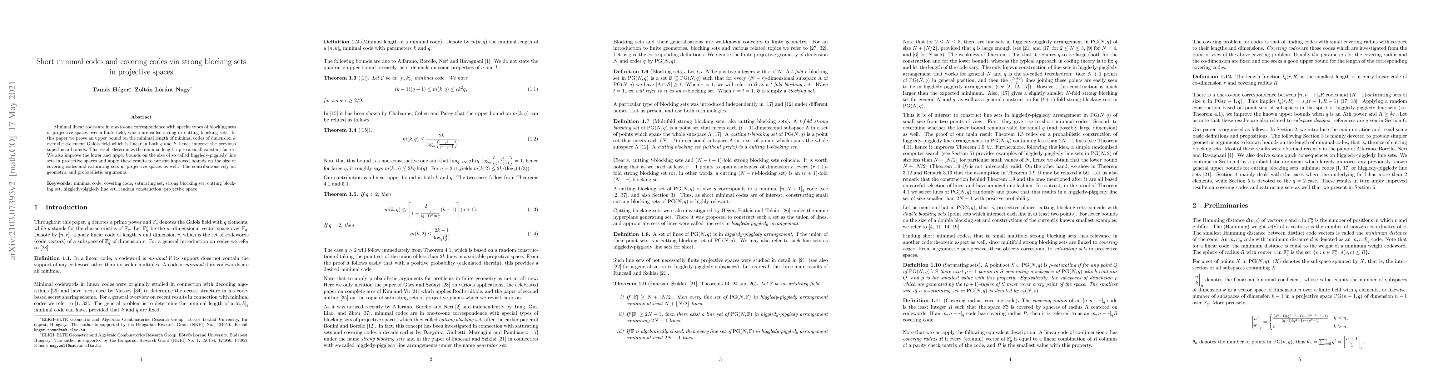 Minimal linear codes are in one-to-one correspondence with special types of blocking sets of projective spaces over a finite field, which are called strong or cutting blocking sets. In this paper we prove an upper bound on the minimal length of minimal codes of dimension $k$ over the $q$-element Galois field which is linear in both $q$ and $k$, hence improve the previous superlinear bounds. This result determines the minimal length up to a small constant factor. We also improve the lower and upper bounds on the size of so called higgledy-piggledy line sets in projective spaces and apply these results to present improved bounds on the size of covering codes and saturating sets in projective spaces as well. The contributions rely on geometric and probabilistic arguments.