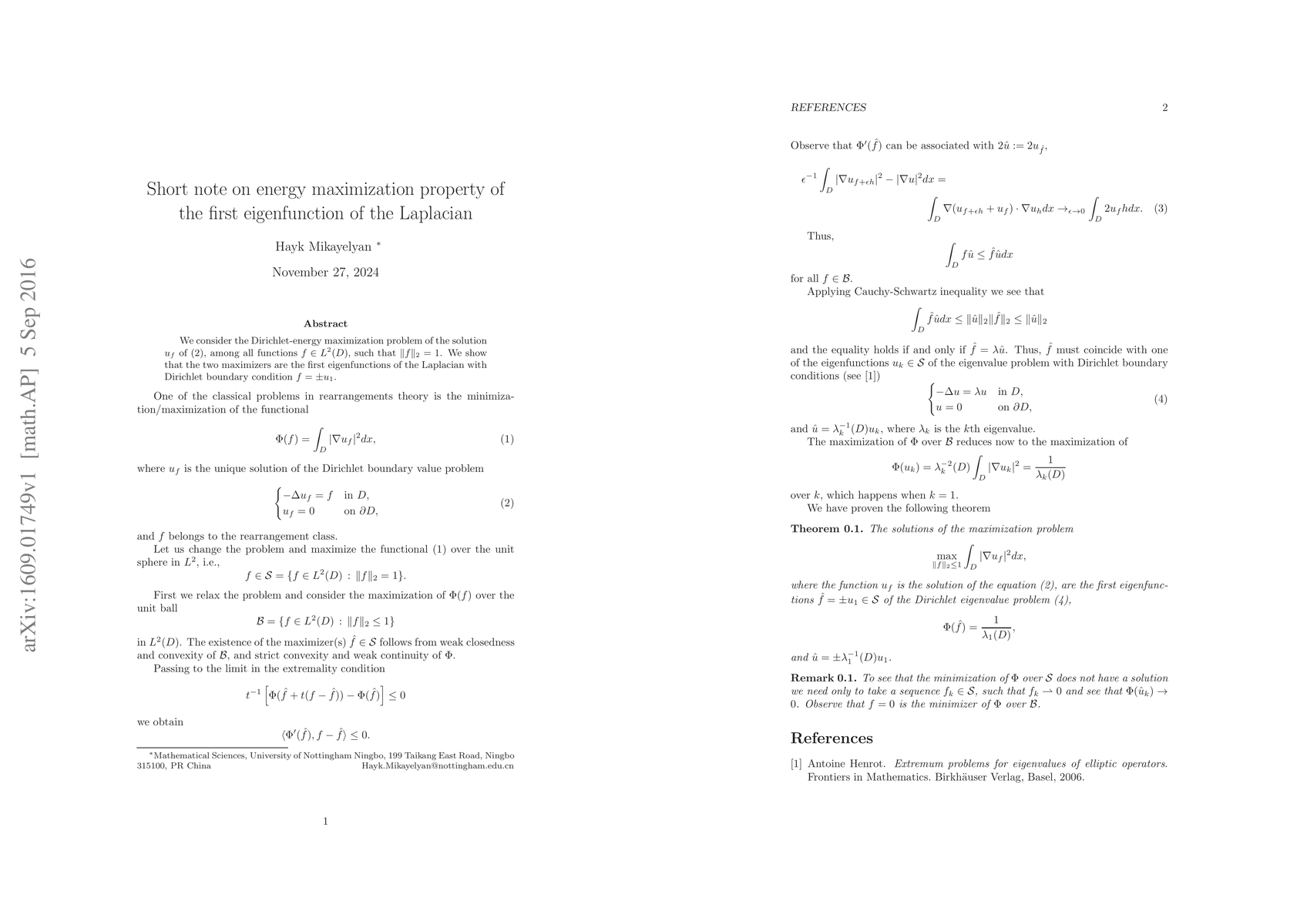 We consider the Dirichlet-energy maximization problem of the solution $u_f$ of (\ref{main}), among all functions $f\in L^2(D)$, such that $\|f\|_2= 1$. We show that the two maximizers are the first eigenfunctions of the Laplacian with Dirichlet boundary condition $f=\pm u_1$.