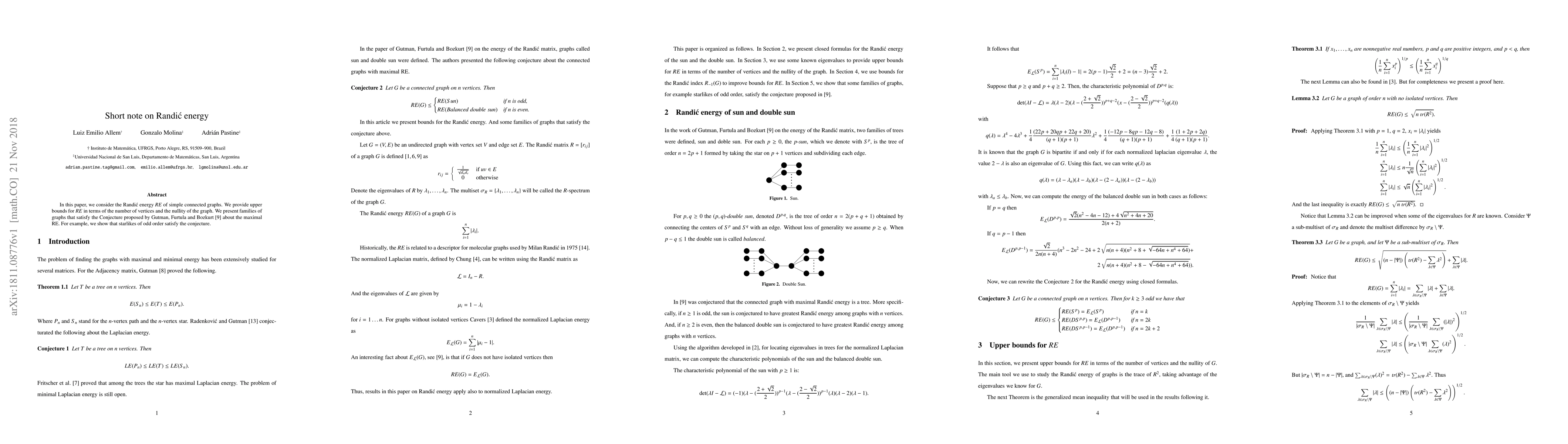 In this paper, we consider the Randi\'{c} energy $RE$ of simple connected graphs. We provide upper bounds for $RE$ in terms of the number of vertices and the nullity of the graph. We present families of graphs that satisfy the Conjecture proposed by Gutman, Furtula and Bozkurt \cite{Gutman1} about the maximal RE. For example, we show that starlikes of odd order satisfy the conjecture.
