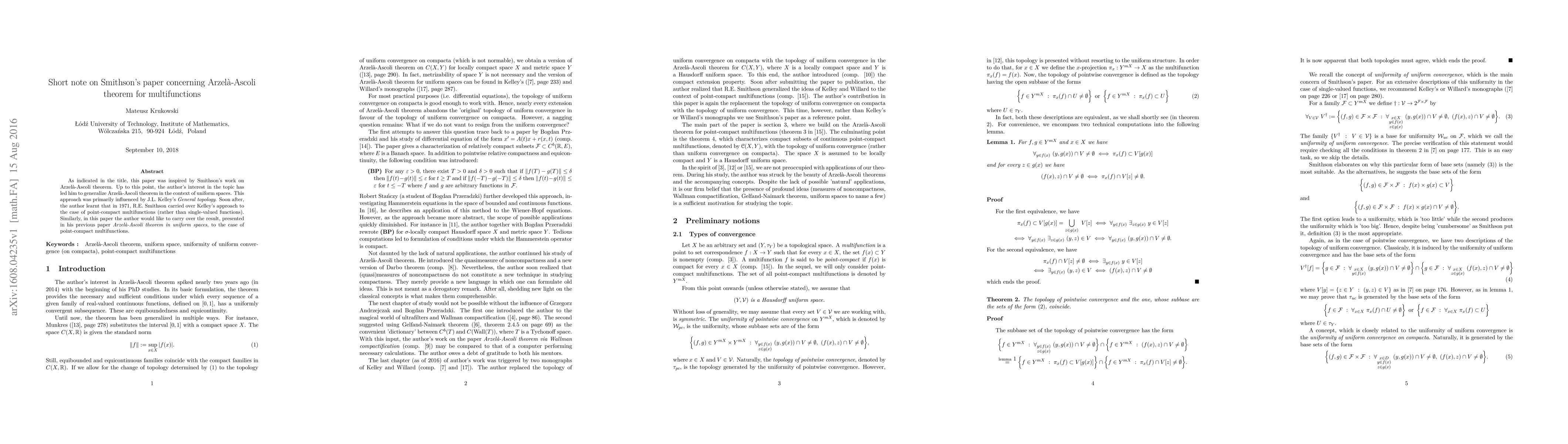 Smithson's paper extends the Arzel\`a-Ascoli theorem to point-compact multifunctions, inspired by J.L. Kelley's general topology. The author aims to generalize this result further in the context of uniform spaces.