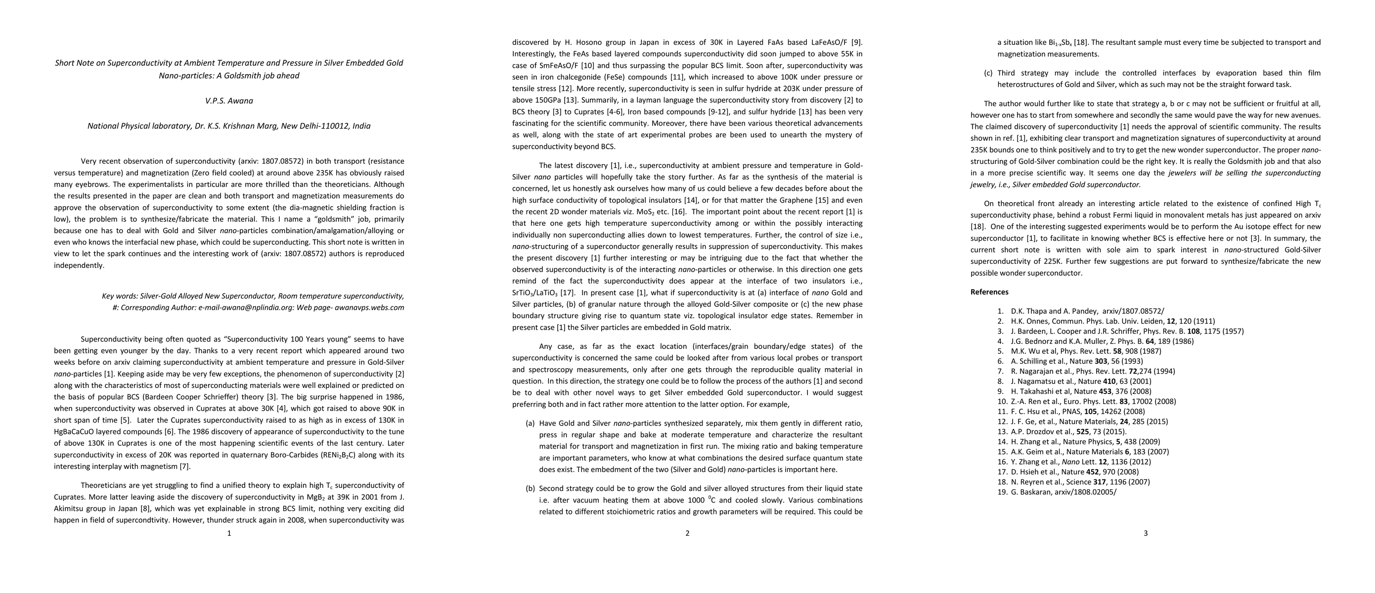 Very recent observation of superconductivity in both transport (resistance versus temperature) and magnetization (Zero field cooled) at around 235 K has obviously raised many eyebrows. The experimental fraternity in particular is more thrilled. Although the results presented in the paper are clean and both transport and magnetization measurements do approve the observation of superconductivity to some extent (the shielding fraction is low), the problem is to synthesize or fabricate the material. This I name a goldsmith job, primarily because one has to deal with Gold and Silver nano particles combination/amalgamation/alloying or even who knows the inter-facial new phase, which could be superconducting. This short note is written in view to let the spark continues and the interesting work of ) authors is reproduced independently.