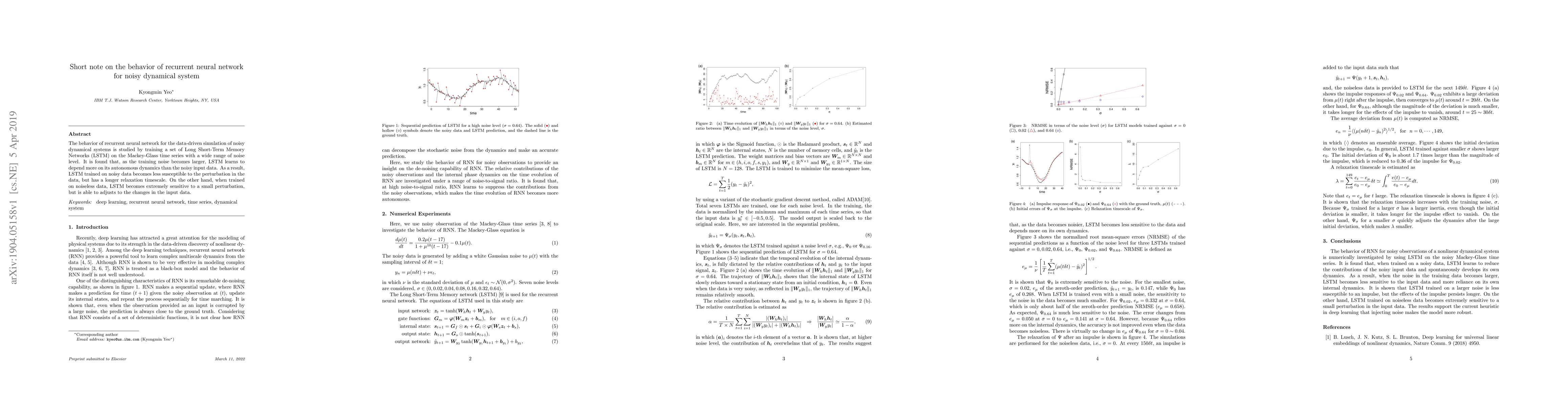 The behavior of recurrent neural network for the data-driven simulation of noisy dynamical systems is studied by training a set of Long Short-Term Memory Networks (LSTM) on the Mackey-Glass time series with a wide range of noise level. It is found that, as the training noise becomes larger, LSTM learns to depend more on its autonomous dynamics than the noisy input data. As a result, LSTM trained on noisy data becomes less susceptible to the perturbation in the data, but has a longer relaxation timescale. On the other hand, when trained on noiseless data, LSTM becomes extremely sensitive to a small perturbation, but is able to adjusts to the changes in the input data.