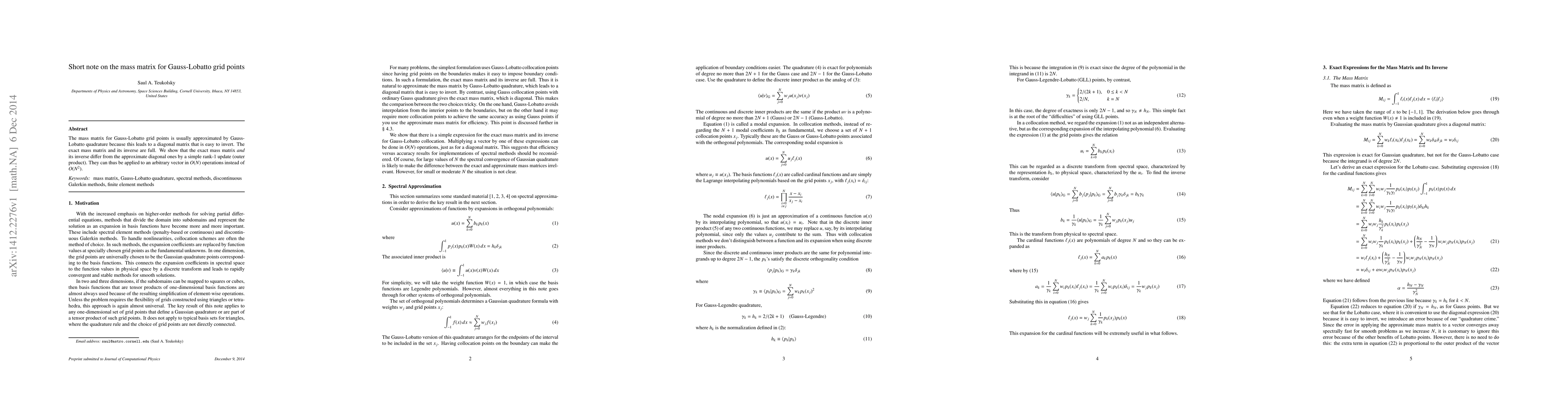 Summary: This paper demonstrates that the exact mass matrix for Gauss-Lobatto grid points and its inverse can be efficiently computed using a rank-1 update, allowing for $O(N)$ operations instead of the usual $O(N^2)$ required for full matrices. This approach provides an accurate alternative to the commonly used diagonal approximation via Gauss-Lobatto quadrature.