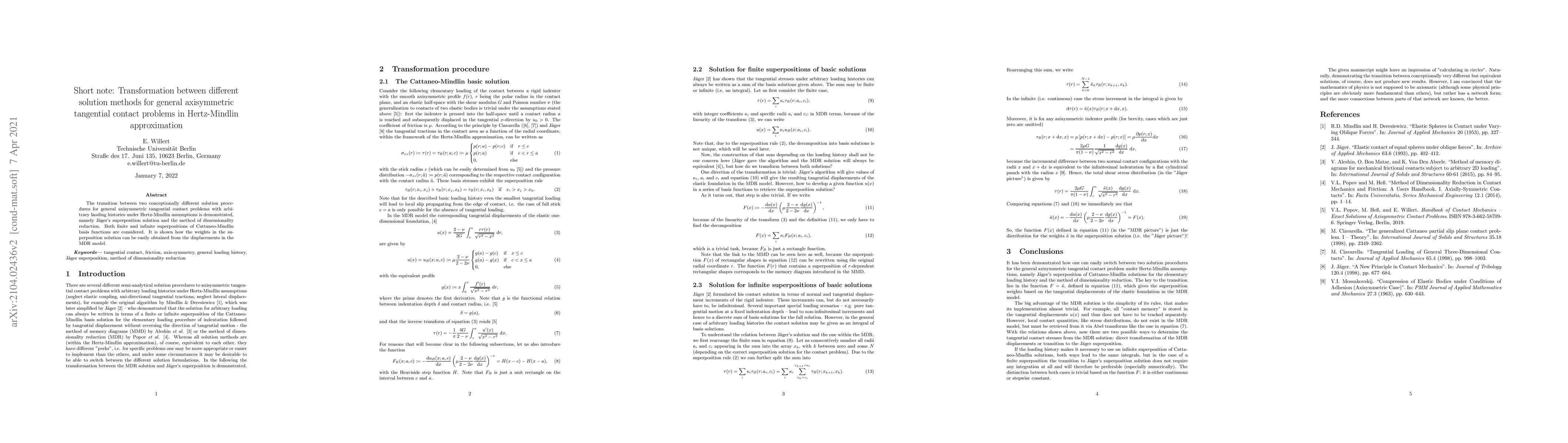 Researchers demonstrate how two different solution methods for axisymmetric tangential contact problems in Hertz-Mindlin approximation can be linked, allowing for the use of a single model with easily obtainable weights.