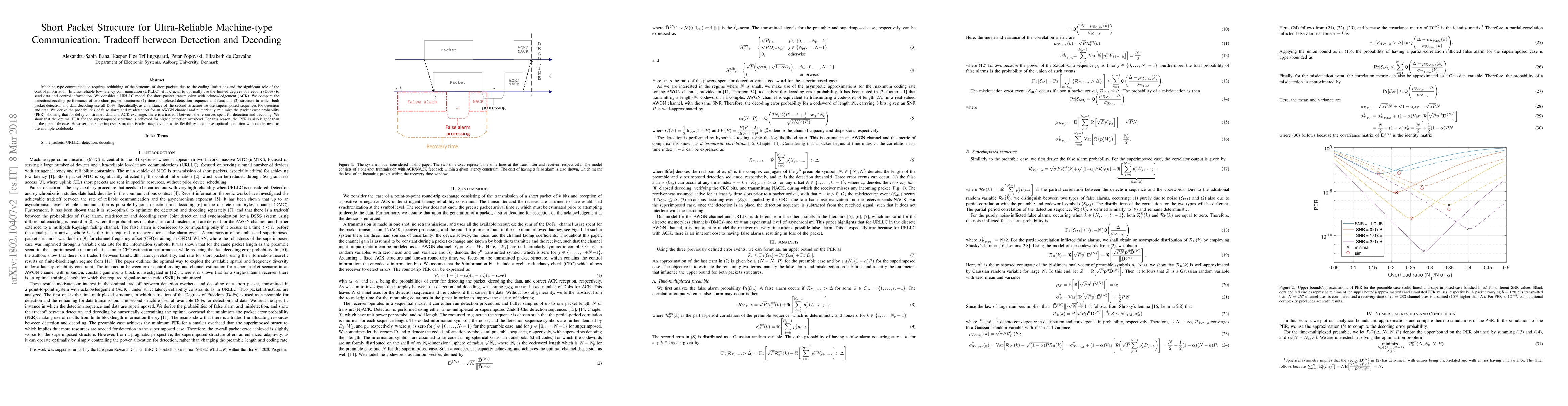 This paper investigates short packet structures for ultra-reliable low-latency communication (URLLC), focusing on the tradeoff between detection and decoding performance. It compares two structures: time-multiplexed detection and data, and a superimposed sequence approach, finding that the latter achieves optimal performance at the cost of higher detection overhead.