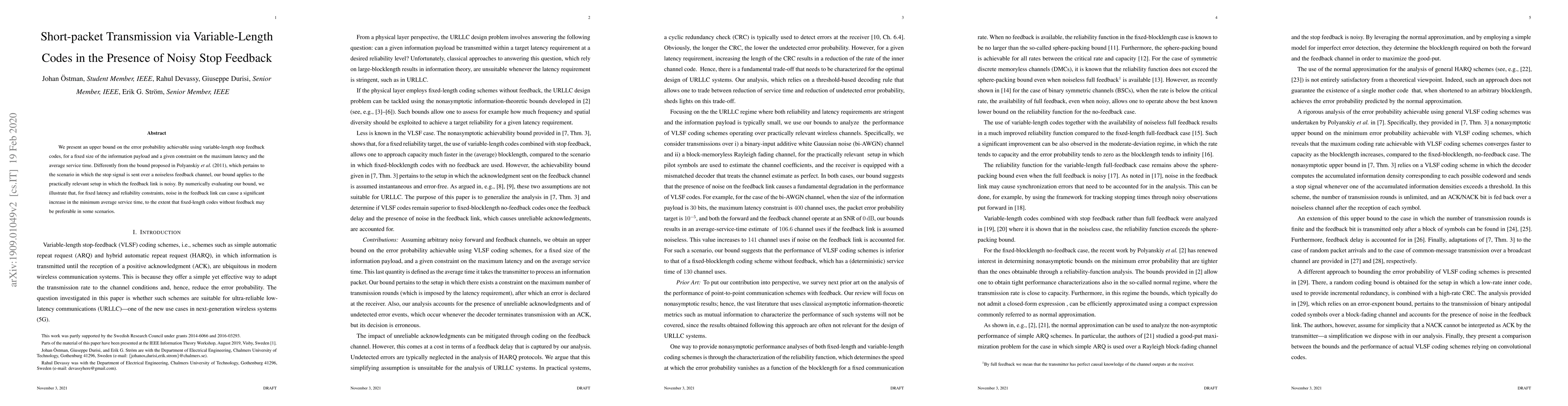 This paper establishes an upper bound on the error probability for short-packet transmission using variable-length stop feedback codes under noisy feedback conditions. It shows that noisy feedback can significantly increase average service time, suggesting that fixed-length codes may sometimes be more efficient.