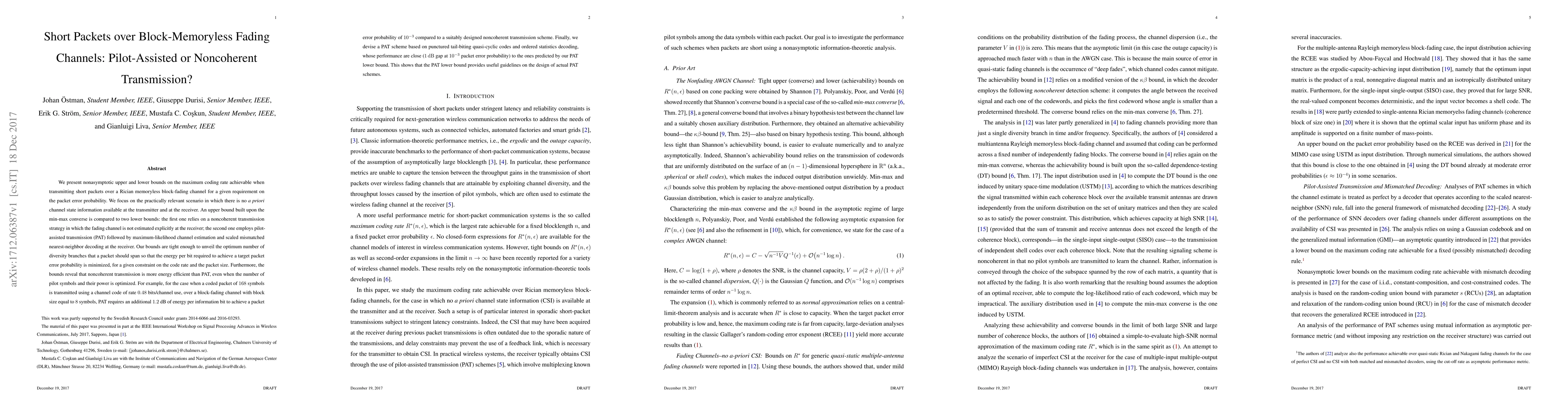 We present nonasymptotic upper and lower bounds on the maximum coding rate achievable when transmitting short packets over a Rician memoryless block-fading channel for a given requirement on the packet error probability. We focus on the practically relevant scenario in which there is no \emph{a priori} channel state information available at the transmitter and at the receiver. An upper bound built upon the min-max converse is compared to two lower bounds: the first one relies on a noncoherent transmission strategy in which the fading channel is not estimated explicitly at the receiver; the second one employs pilot-assisted transmission (PAT) followed by maximum-likelihood channel estimation and scaled mismatched nearest-neighbor decoding at the receiver. Our bounds are tight enough to unveil the optimum number of diversity branches that a packet should span so that the energy per bit required to achieve a target packet error probability is minimized, for a given constraint on the code rate and the packet size. Furthermore, the bounds reveal that noncoherent transmission is more energy efficient than PAT, even when the number of pilot symbols and their power is optimized. For example, for the case when a coded packet of $168$ symbols is transmitted using a channel code of rate $0.48$ bits/channel use, over a block-fading channel with block size equal to $8$ symbols, PAT requires an additional $1.2$ dB of energy per information bit to achieve a packet error probability of $10^{-3}$ compared to a suitably designed noncoherent transmission scheme. Finally, we devise a PAT scheme based on punctured tail-biting quasi-cyclic codes and ordered statistics decoding, whose performance are close ($1$ dB gap at $10^{-3}$ packet error probability) to the ones predicted by our PAT lower bound. This shows that the PAT lower bound provides useful guidelines on the design of actual PAT schemes.