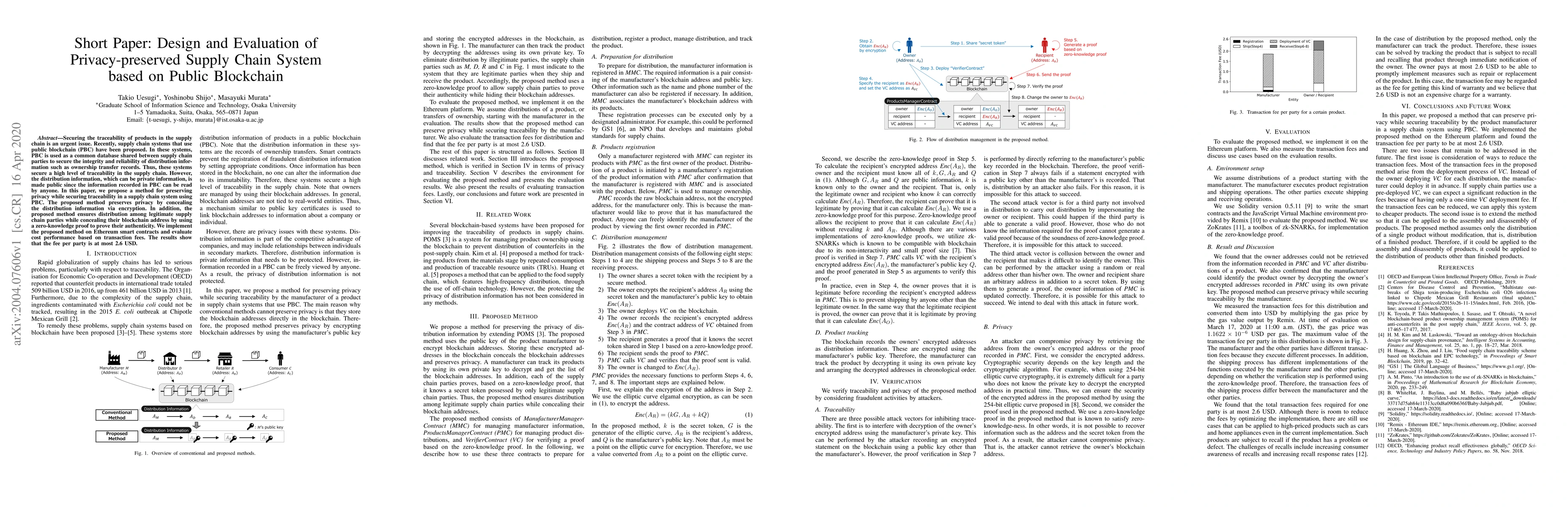 This paper proposes a privacy-preserving supply chain system using public blockchain, addressing the challenge of maintaining traceability while keeping distribution information confidential. It employs encryption to conceal private data and zero-knowledge proofs to verify party authenticity without revealing blockchain addresses, achieving cost-effective performance with transaction fees up to 2.6 USD per party.