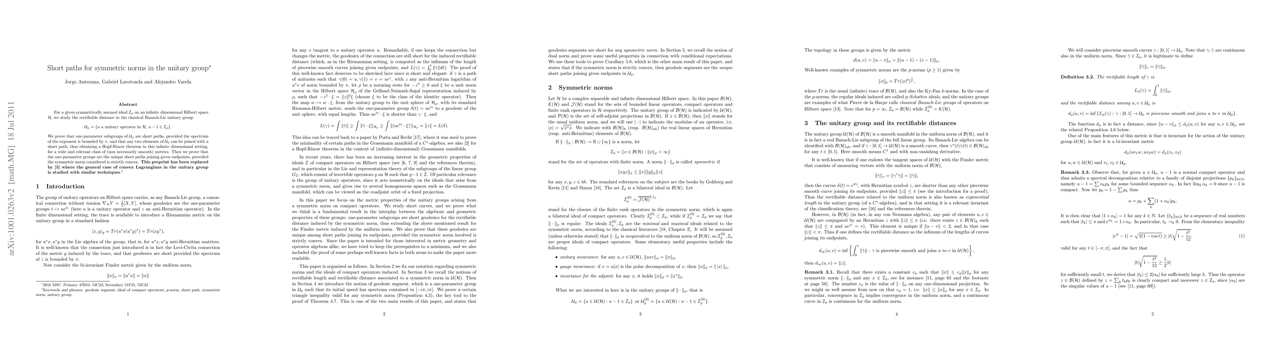 For a given symmetrically normed ideal I on an infinite dimensional Hilbert space H, we study the rectifiable distance in the classical Banach-Lie unitary group $$ U_I={u is a unitary operator in H, u-1\in I}. $$ We prove that one-parameter subgroups of U_I are short paths, provided the spectrum of the exponent is bounded by $\pi$, and that any two elements of U_I can be joined with a short path, thus obtaining a Hopf-Rinow theorem in this infinite dimensional setting, for a wide and relevant class of (non necessarily smooth) metrics. Then we prove that the one-parameter groups are the unique short paths joining given endpoints, provided the symmetric norm considered is strictly convex.
