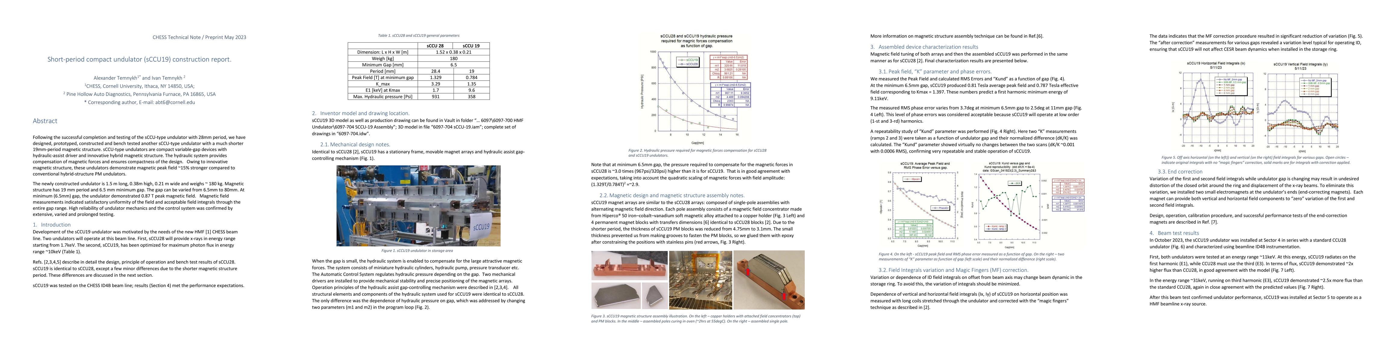 This report details the construction and testing of a new short-period compact undulator (sCCU19) with a 19mm magnetic period, showing a 15% stronger magnetic peak field compared to conventional designs. The device, compact and weighing ~180 kg, demonstrated satisfactory magnetic field uniformity and high reliability after extensive testing.
