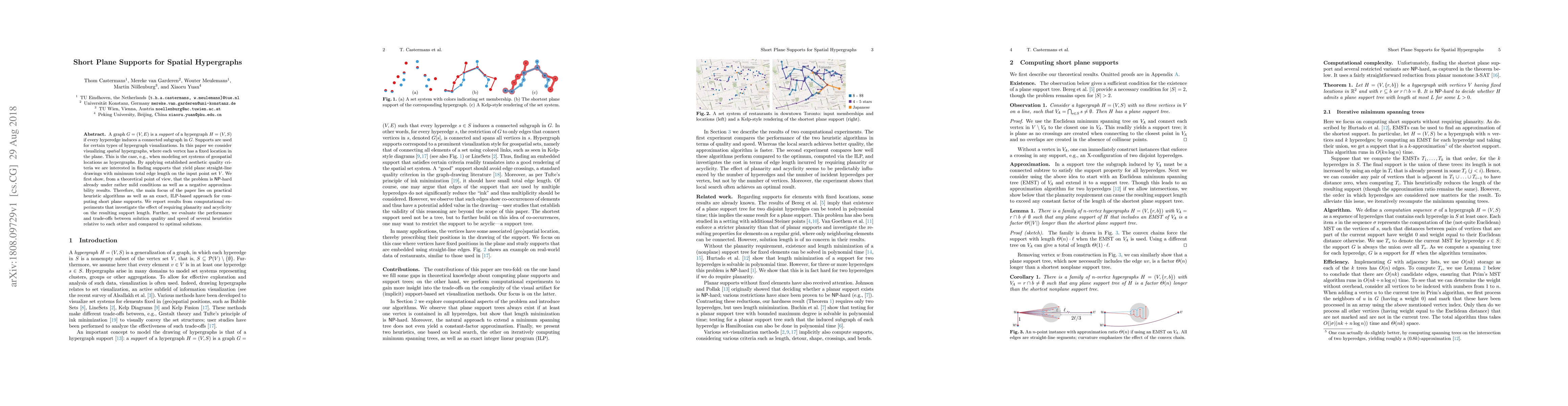 A graph $G=(V,E)$ is a support of a hypergraph $H=(V,S)$ if every hyperedge induces a connected subgraph in $G$. Supports are used for certain types of hypergraph visualizations. In this paper we consider visualizing spatial hypergraphs, where each vertex has a fixed location in the plane. This is the case, e.g., when modeling set systems of geospatial locations as hypergraphs. By applying established aesthetic quality criteria we are interested in finding supports that yield plane straight-line drawings with minimum total edge length on the input point set $V$. We first show, from a theoretical point of view, that the problem is NP-hard already under rather mild conditions as well as a negative approximability results. Therefore, the main focus of the paper lies on practical heuristic algorithms as well as an exact, ILP-based approach for computing short plane supports. We report results from computational experiments that investigate the effect of requiring planarity and acyclicity on the resulting support length. Further, we evaluate the performance and trade-offs between solution quality and speed of several heuristics relative to each other and compared to optimal solutions.