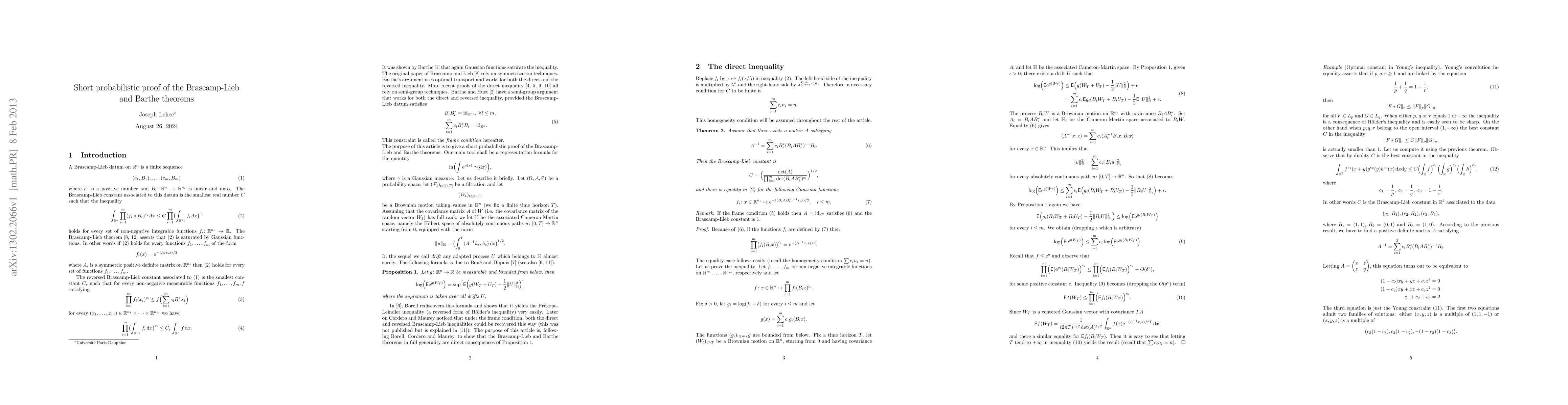 This paper provides a short probabilistic proof of the Brascamp-Lieb and Barthe theorems, two inequalities related to Young's convolution inequality, using an approach similar to Borell's stochastic proof.