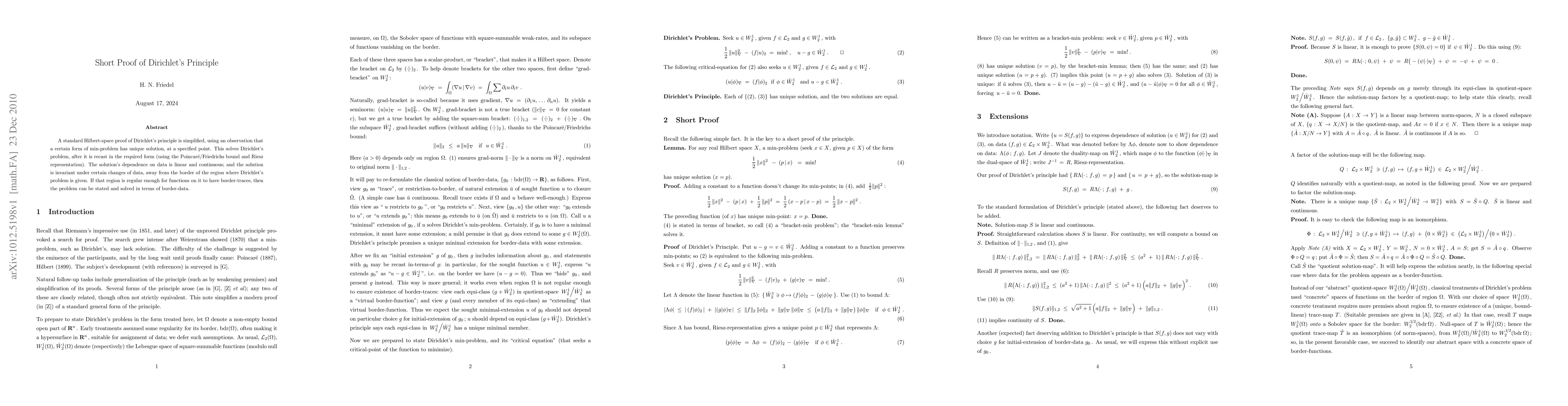 A standard Hilbert-space proof of Dirichlet's principle is simplified, using an observation that a certain form of min-problem has unique solution, at a specified point. This solves Dirichlet's problem, after it is recast in the required form (using the Poincare/Friedrichs bound and Riesz representation). The solution's dependence on data is linear and continuous; and the solution is invariant under certain changes of data, away from the border of the region where Dirichlet's problem is given. If that region is regular enough for functions on it to have border-traces, then the problem can be stated and solved in terms of border-data.