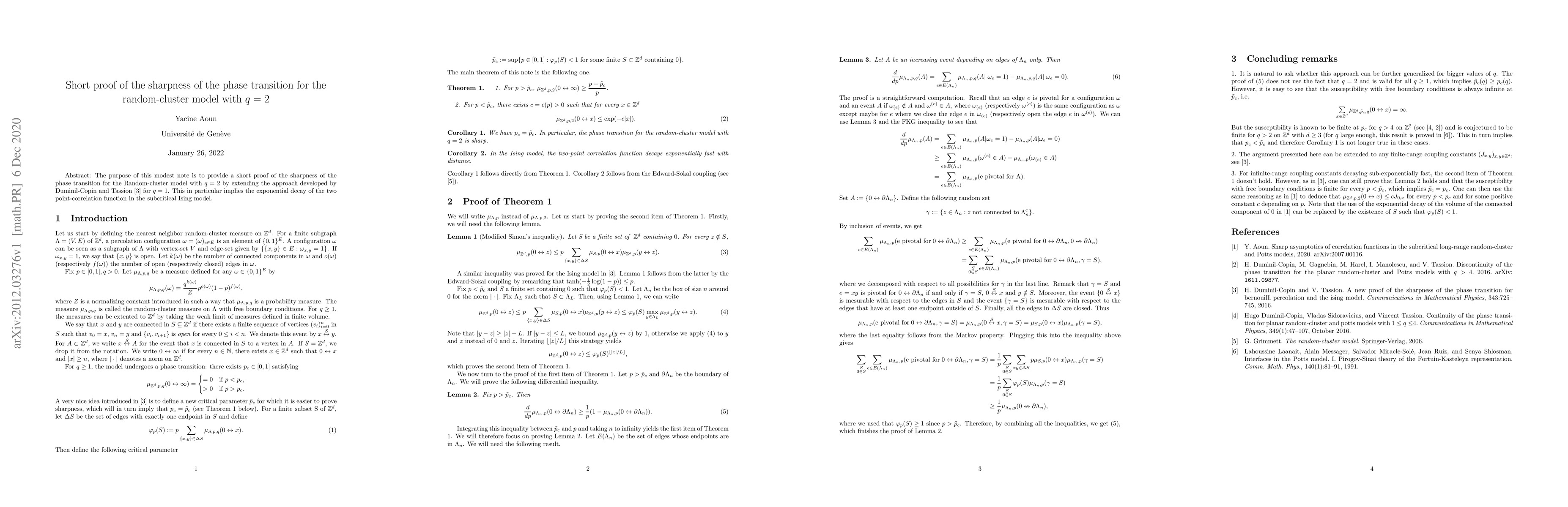 This paper offers a concise proof demonstrating the sharpness of the phase transition in the Random-cluster model with $q=2$, extending techniques from the $q=1$ case. It also confirms the exponential decay of the two-point correlation function in the subcritical Ising model.