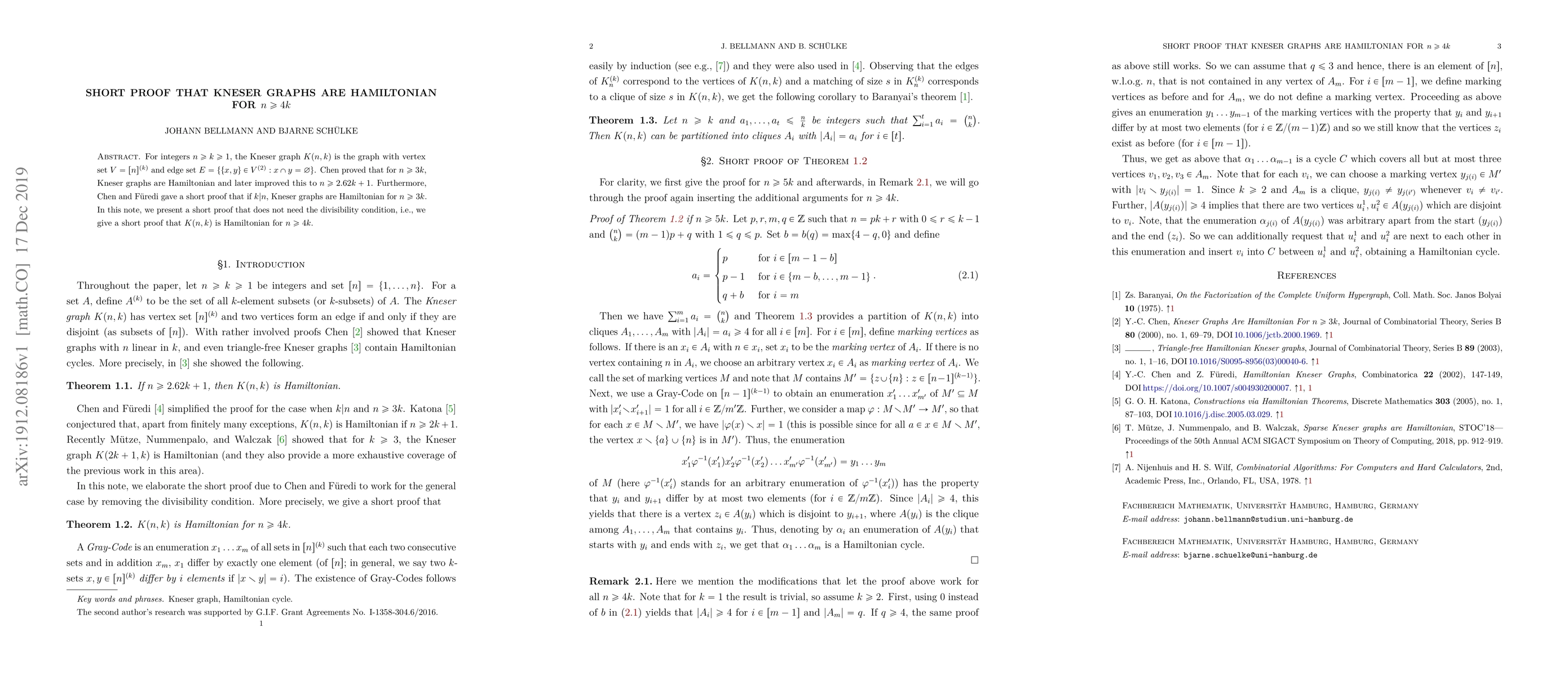 For integers $n\geq k\geq 1$, the Kneser graph $K(n,k)$ is the graph with vertex set $V=[n]^{(k)}$ and edge set $E=\{\{x,y\} \in V^{(2)}: x\cap y=\emptyset\}$. Chen proved that for $n\geq 3k$, Kneser graphs are Hamiltonian and later improved this to $n\geq 2.62k+1$. Furthermore, Chen and F\"uredi gave a short proof that if $k | n$, Kneser graphs are Hamiltonian for $n\geq 3k$. In this note, we present a short proof that does not need the divisibility condition, i.e., we give a short proof that $K(n,k)$ is Hamiltonian for $n\geq 4k$.