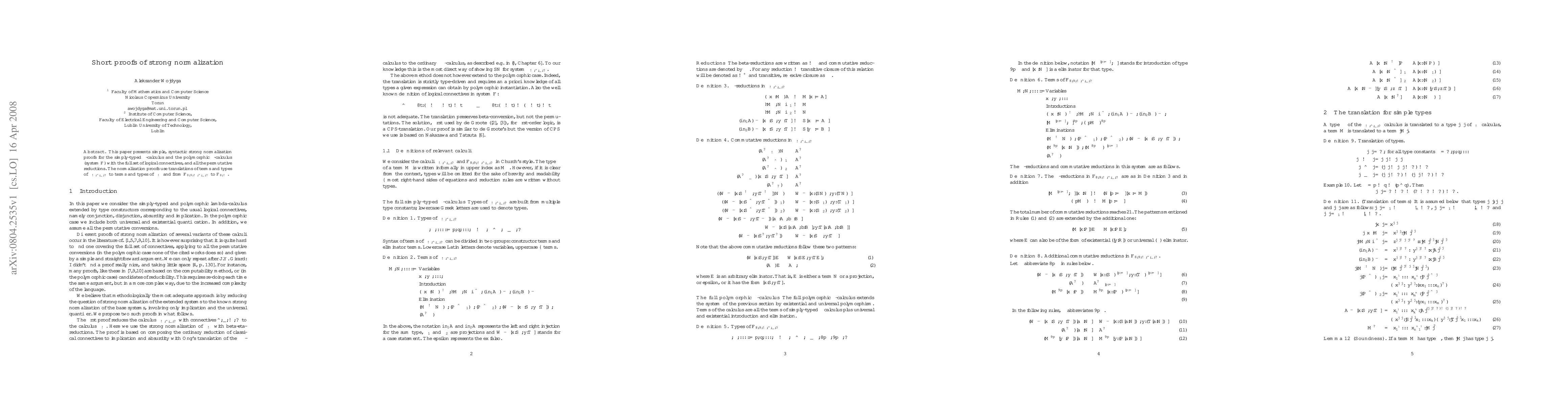 This paper presents simple, syntactic strong normalization proofs for the simply-typed lambda-calculus and the polymorphic lambda-calculus (system F) with the full set of logical connectives, and all the permutative reductions. The normalization proofs use translations of terms and types to systems, for which strong normalization property is known.