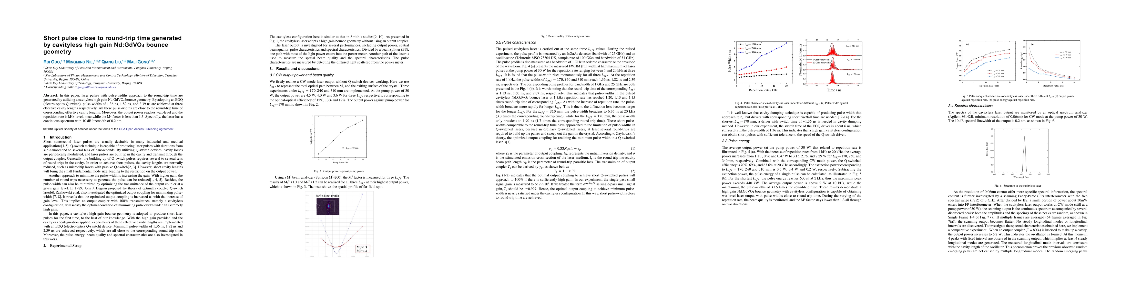 The paper presents a cavityless high gain Nd:GdVO4 bounce geometry generating short pulses near round-trip time using an EOQ. Pulse-widths of 1.36 ns, 1.82 ns, and 2.39 ns were achieved at different effective cavity lengths, with watt-level output power, kHz-level repetition rate, and M2 factor < 1.3. The laser exhibits a continuous spectrum with a 10 dB linewidth of 0.2 nm.