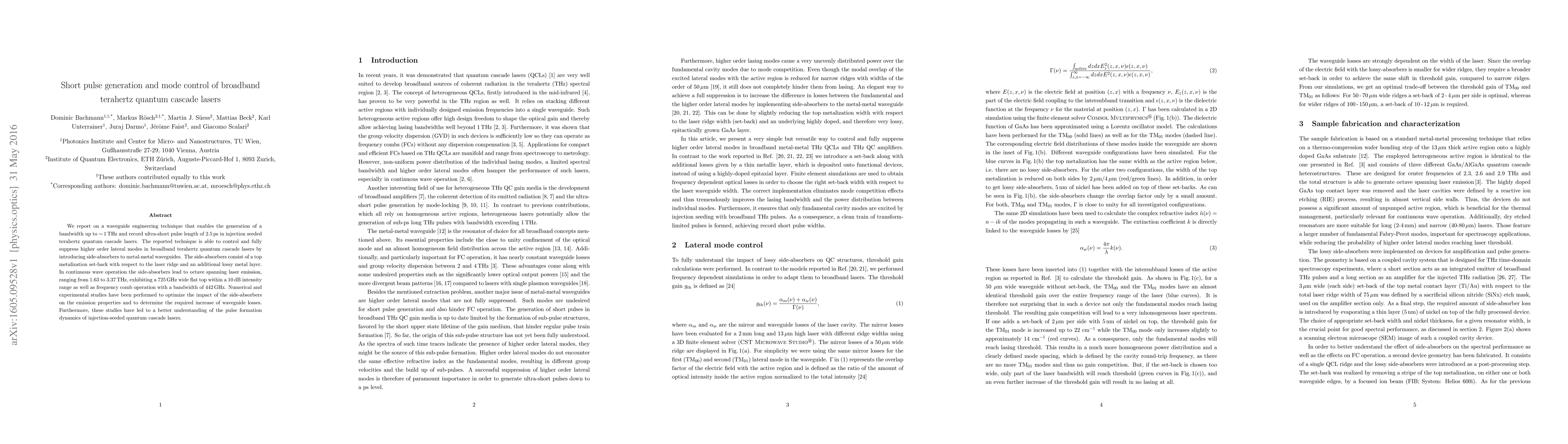 This paper presents a waveguide engineering technique for generating ultra-short pulses and controlling modes in broadband terahertz quantum cascade lasers, utilizing side-absorbers to achieve octave-spanning emission and suppress higher order lateral modes. Numerical and experimental studies optimize the side-absorbers' impact and enhance understanding of pulse formation dynamics.