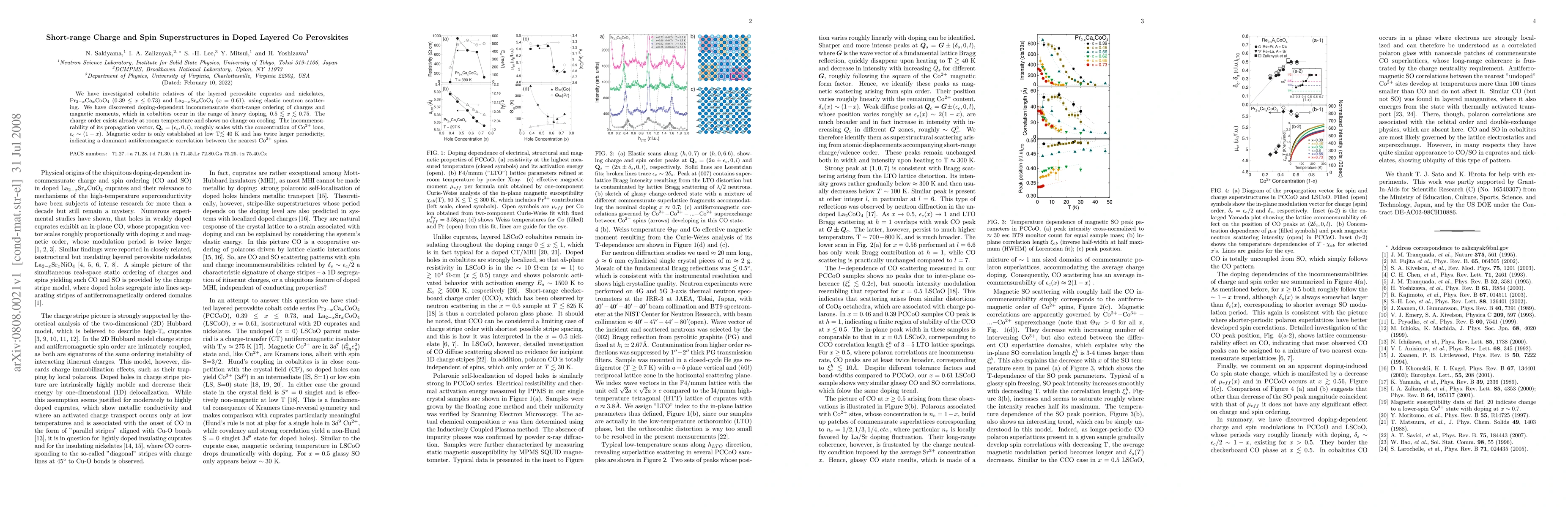 We have investigated cobaltite relatives of the layered perovskite cuprates and nickelates, Pr$_{2-x}$Ca$_x$CoO$_4$ ($0.39 \leq x \leq 0.73$) and La$_{2-x}$Sr$_x$CoO$_4$ ($x = 0.61$), using elastic neutron scattering. We have discovered doping-dependent incommensurate short-range ordering of charges and magnetic moments, which in cobaltites occur in the range of heavy doping, $ 0.5 \lesssim x \lesssim 0.75$. The charge order exists already at room temperature and shows no change on cooling. The incommensurability of its propagation vector, ${\bf Q}_c = (\epsilon_c,0,l)$, roughly scales with the concentration of Co$^{2+}$ ions, $\epsilon_c \sim (1-x)$. Magnetic order is only established at low T$\lesssim 40$ K and has twice larger periodicity, indicating a dominant antiferromagnetic correlation between the nearest Co$^{2+}$ spins.