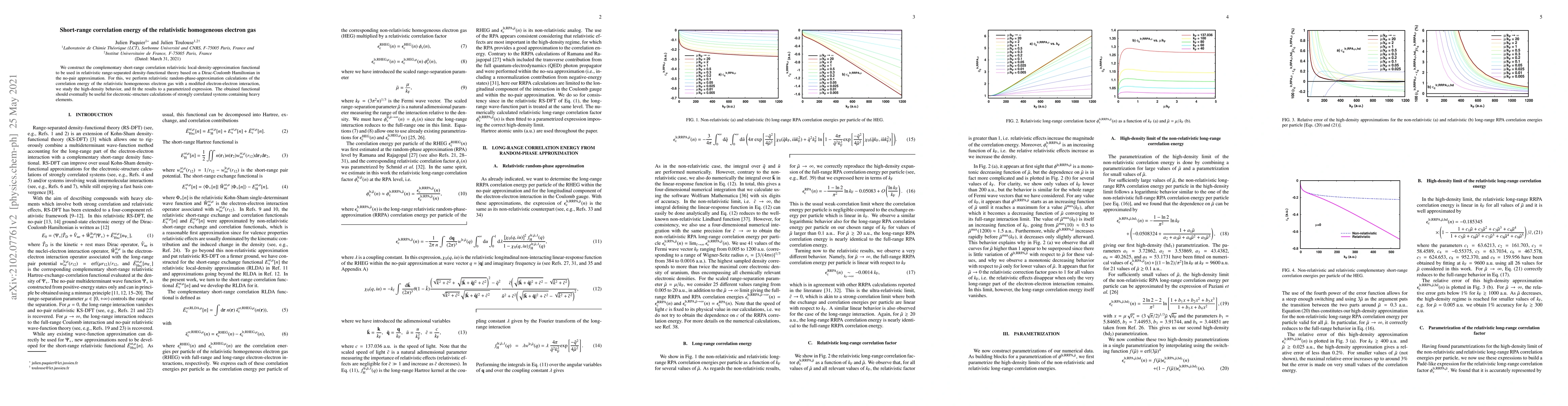 This paper develops a relativistic local-density-approximation functional for short-range correlation energy in a homogeneous electron gas, derived from relativistic random-phase-approximation calculations and fitted to a parametrized expression, aiming to enhance electronic-structure calculations in systems with heavy elements.