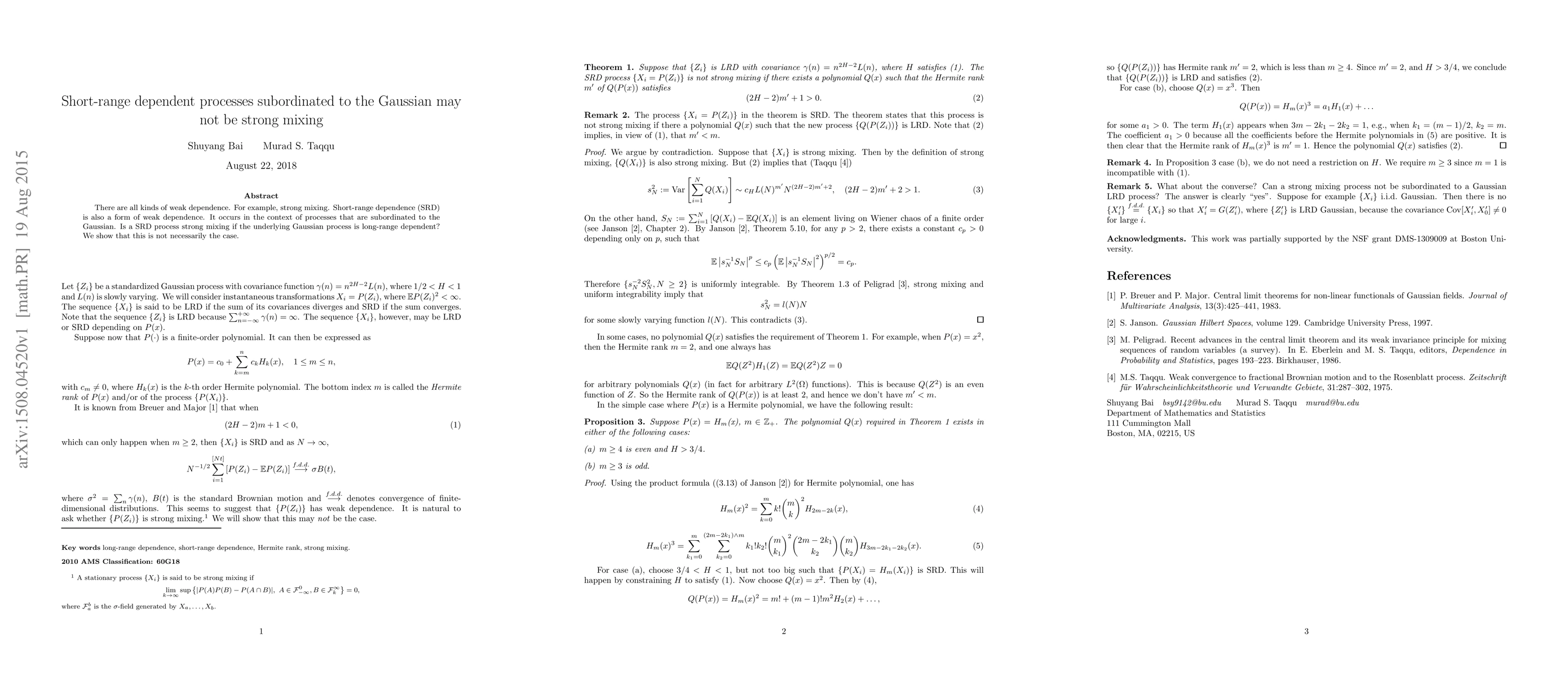 This paper investigates whether short-range dependent processes, when subordinated to a Gaussian process, necessarily exhibit strong mixing. It concludes that SRD processes may not be strong mixing even if the underlying Gaussian process has long-range dependence.