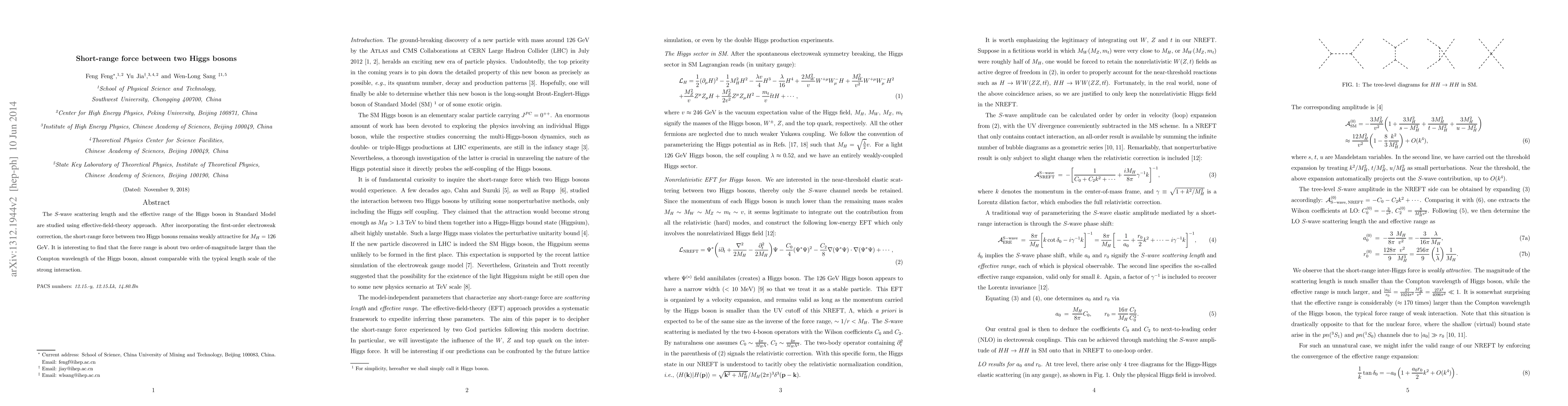 The paper investigates the short-range force between two Higgs bosons in the Standard Model, finding it remains weakly attractive with a range about 2 orders of magnitude larger than the Compton wavelength.
