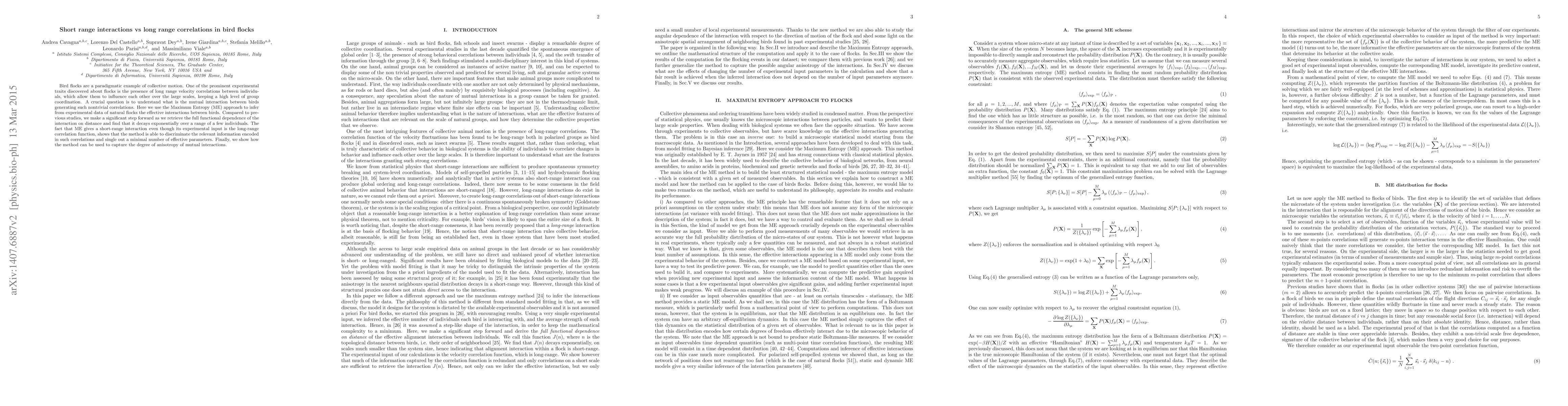 This study utilizes the Maximum Entropy approach to analyze the interactions in bird flocks, revealing that despite long-range velocity correlations among individuals, the effective interactions between birds are short-range and decay exponentially over a few individuals, demonstrating the method's ability to extract minimal effective parameters from correlation data.