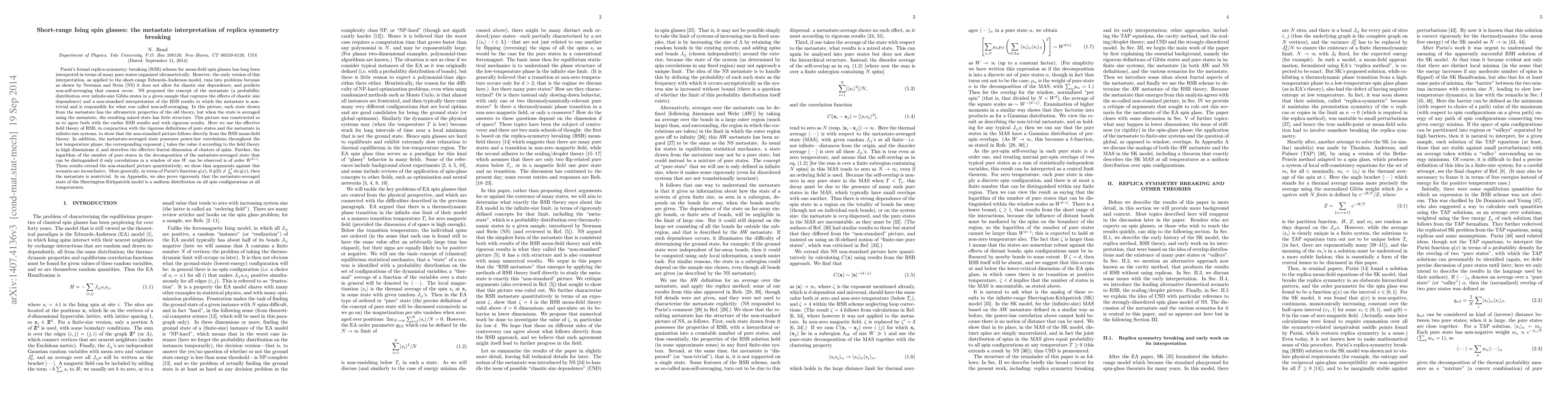 This paper reinterprets Parisi's replica-symmetry-breaking theory for short-range Ising spin glasses using the metastate interpretation, showing that it resolves issues with chaotic size dependence and non-self-averaging. The metastate, which captures the effects of chaotic size dependence, leads to power-law correlations in the low-temperature phase with an exponent $\zeta=4$ in high dimensions.