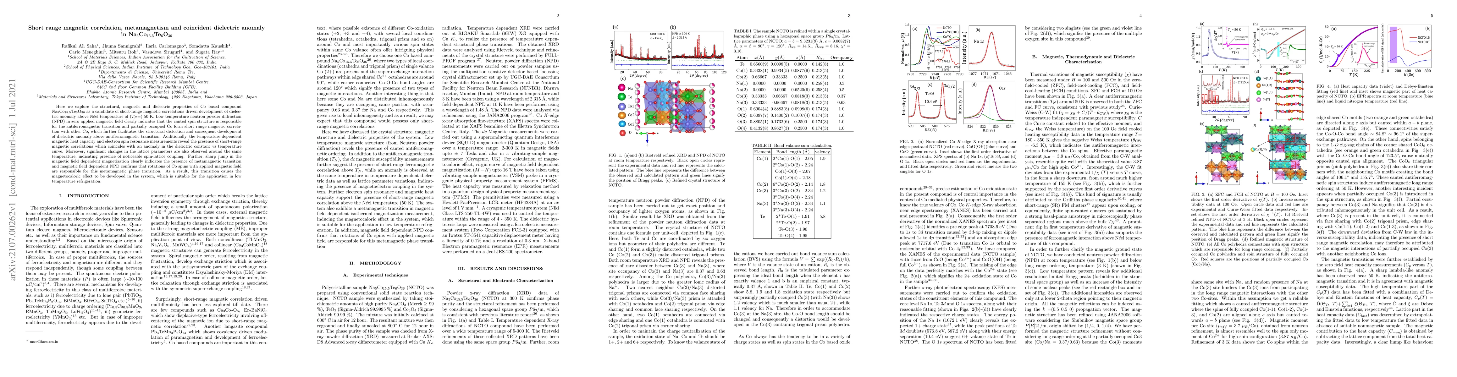 Here we explore the structural, magnetic and dielectric properties of Co based compound Na$_5$Co$_{15.5}$Te$_6$O$_{36}$ as a candidate of short-range magnetic correlations driven development of dielectric anomaly above N$\acute{e}$el temperature of ($T_N$=) 50 K. Low temperature neutron powder diffraction (NPD) in zero applied magnetic field clearly indicates that the canted spin structure is responsible for the antiferromagnetic transition and partially occupied Co form short range magnetic correlation with other Co, which further facilitates the structural distortion and consequent development of dielectric anomaly above antiferromagnetic transition. Additionally, the temperature dependent magnetic heat capacity and electron spin resonance measurements reveal the presence of short-range magnetic correlations which coincides with an anomaly in the dielectric constant vs temperature curve. Moreover, significant changes in the lattice parameters are also observed around the same temperature, indicating presence of noticeable spin-lattice coupling. Further, sharp jump in the magnetic field dependent magnetization clearly indicates the presence of metamagnetic transition and magnetic field dependent NPD confirms that rotations of Co spins with applied magnetic field are responsible for this metamagnetic phase transition. As a result, this transition causes the magnetocaloric effect to be developed in the system, which is suitable for the application in low temperature refrigeration.