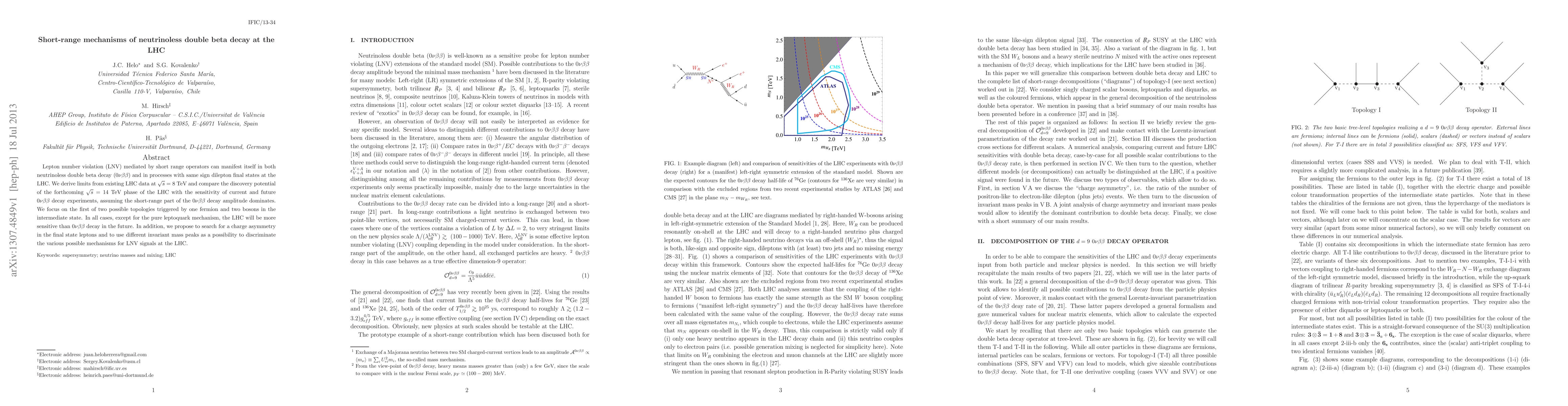 Lepton number violation (LNV) mediated by short range operators can manifest itself in both neutrinoless double beta decay and in processes with same sign dilepton final states at the LHC. We derive limits from existing LHC data at $\sqrt{s}=8$ TeV and compare the discovery potential of the forthcoming $\sqrt{s}=14$ TeV phase of the LHC with the sensitivity of current and future neutrinoless double beta decay experiments, assuming the short-range part of the decay amplitude dominates. We focus on the first of two possible topologies triggered by one fermion and two bosons in the intermediate state. In all cases, except for the pure leptoquark mechanism, the LHC will be more sensitive than neutrinoless double beta decay in the future. In addition, we propose to search for a charge asymmetry in the final state leptons and to use different invariant mass peaks as a possibility to discriminate the various possible mechanisms for LNV signals at the LHC.