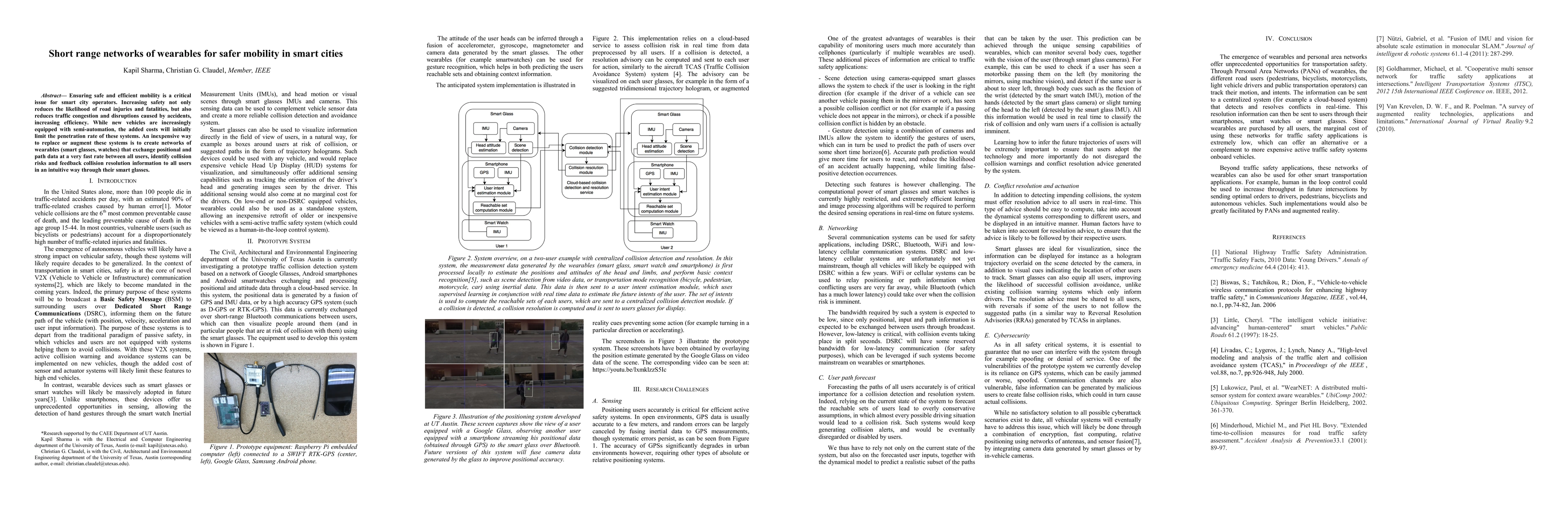 Ensuring safe and efficient mobility is a critical issue for smart city operators. Increasing safety not only reduces the likelihood of road injuries and fatalities, but also reduces traffic congestion and disruptions caused by accidents, increasing efficiency. While new vehicles are increasingly equipped with semi-automation, the added costs will initially limit the penetration rate of these systems. An inexpensive way to replace or augment these systems is to create networks of wearables (smart glasses, watches) that exchange positional and path data at a very fast rate between all users, identify collision risks and feedback collision resolution information to all users in an intuitive way through their smart glasses.