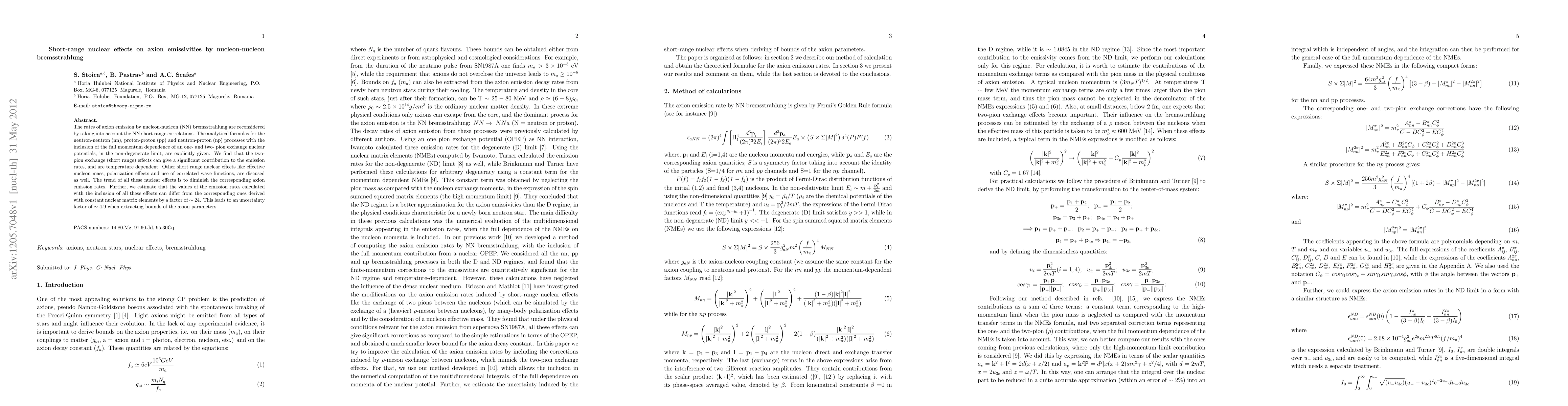 The rates of axion emission by nucleon-nucleon (NN) bremsstrahlung are reconsidered by taking into account the NN short range correlations. The analytical formulas for the neutron-neutron (nn), proton-proton (pp) and neutron-proton (np) processes with the inclusion of the full momentum dependence of an one- and two- pion exchange nuclear potentials, in the non-degenerate limit, are explicitly given. We find that the two-pion exchange (short range) effects can give a significant contribution to the emission rates, and are temperature dependent. Other short range nuclear effects like effective nucleon mass, polarization effects and use of correlated wave functions, are discused as well. The trend of all these nuclear effects is to diminish the corresponding axion emission rates. Further, we estimate that the values of the emission rates calculated with the inclusion of all these effects can differ from the corresponding ones derived with constant nuclear matrix elements by a factor of $\sim 24$. This leads to an uncertainty factor of $\sim 4.9$ when extracting bounds of the axion parameters