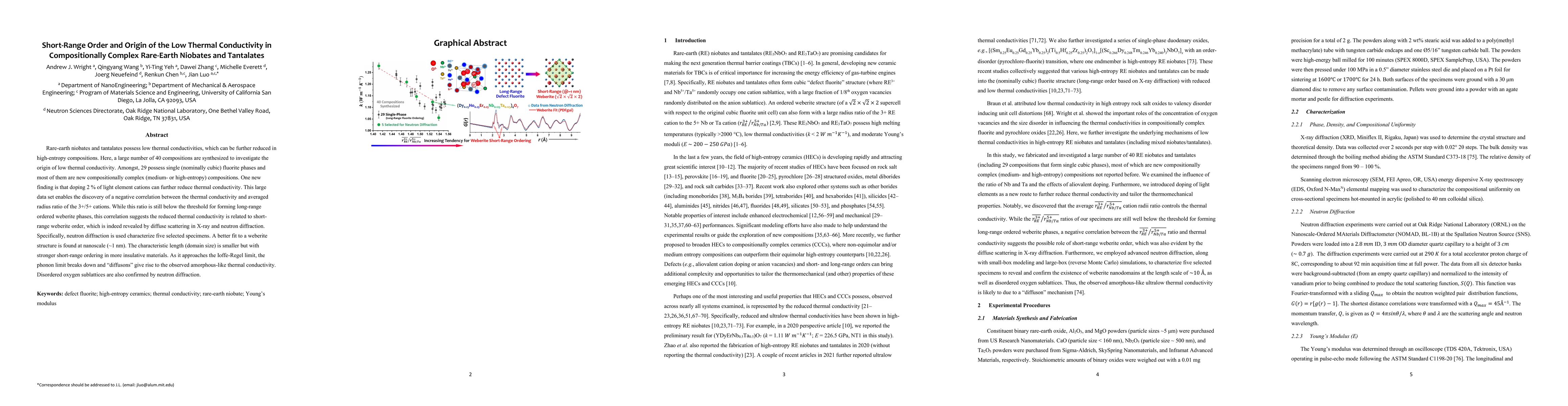 Rare-earth niobates and tantalates possess low thermal conductivities, which can be further reduced in high-entropy compositions. Here, a large number of 40 compositions are synthesized to investigate the origin of low thermal conductivity. Amongst, 29 possess single (nominally cubic) fluorite phases and most of them are new compositionally complex (medium- or high-entropy) compositions. One new finding is that doping 2 % of light element cations can further reduce thermal conductivity. This large data set enables the discovery of a negative correlation between the thermal conductivity and averaged radius ratio of the 3+/5+ cations. While this ratio is still below the threshold for forming long-range ordered weberite phases, this correlation suggests the reduced thermal conductivity is related to short-range weberite order, which is indeed revealed by diffuse scattering in X-ray and neutron diffraction. Specifically, neutron diffraction is used characterize five selected specimens. A better fit to a weberite structure is found at nanoscale (~1 nm). The characteristic length (domain size) is smaller but with stronger short-range ordering in more insulative materials. As it approaches the Ioffe-Regel limit, the phonon limit breaks down and "diffusons" give rise to the observed amorphous-like thermal conductivity. Disordered oxygen sublattices are also confirmed by neutron diffraction.