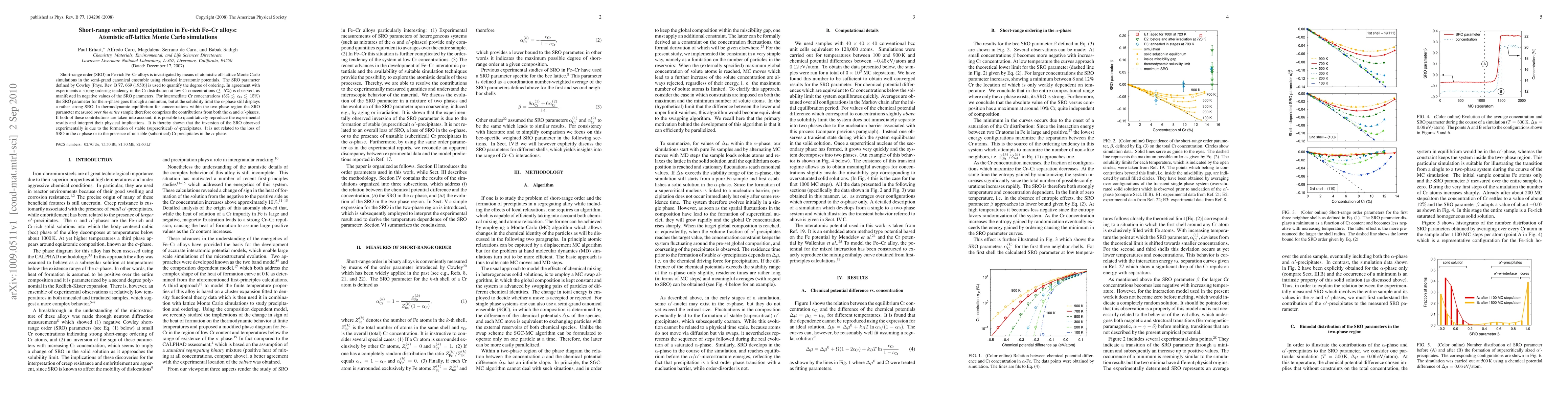This study uses atomistic off-lattice Monte Carlo simulations to investigate short-range order in Fe-rich Fe-Cr alloys, revealing strong ordering tendencies in Cr distribution at low Cr concentrations. The simulations show that the inversion of short-range order at intermediate Cr concentrations is due to the formation of stable alpha-prime precipitates rather than loss of order in the alpha-phase.