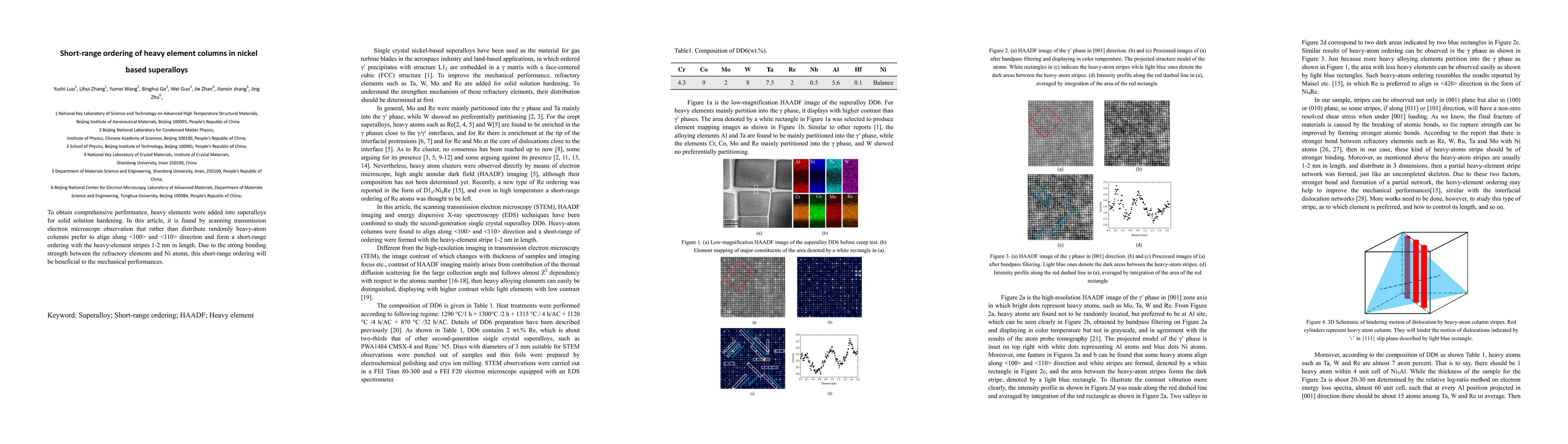 Heavy element columns in nickel-based superalloys form a short-range ordering along <100> and <110> directions, resulting in improved mechanical performance due to strong bonding between refractory elements and Ni atoms.