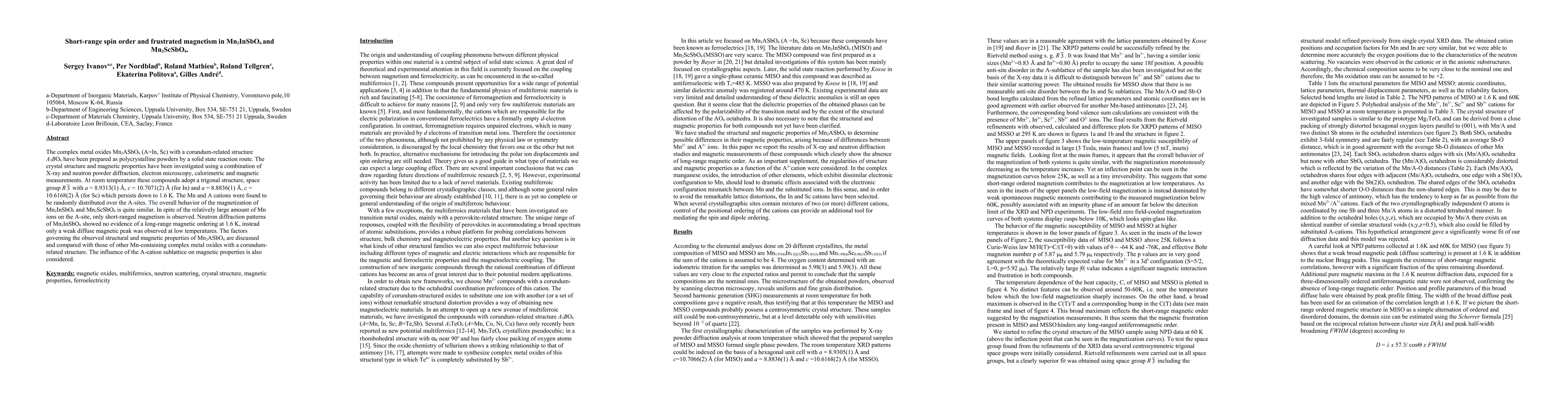 The paper presents a detailed structural and magnetic characterization of Mn2InSbO6 and Mn2ScSbO6 using a combination of experimental techniques, including X-ray and neutron powder diffraction, electron microscopy, calorimetry, and magnetometry.