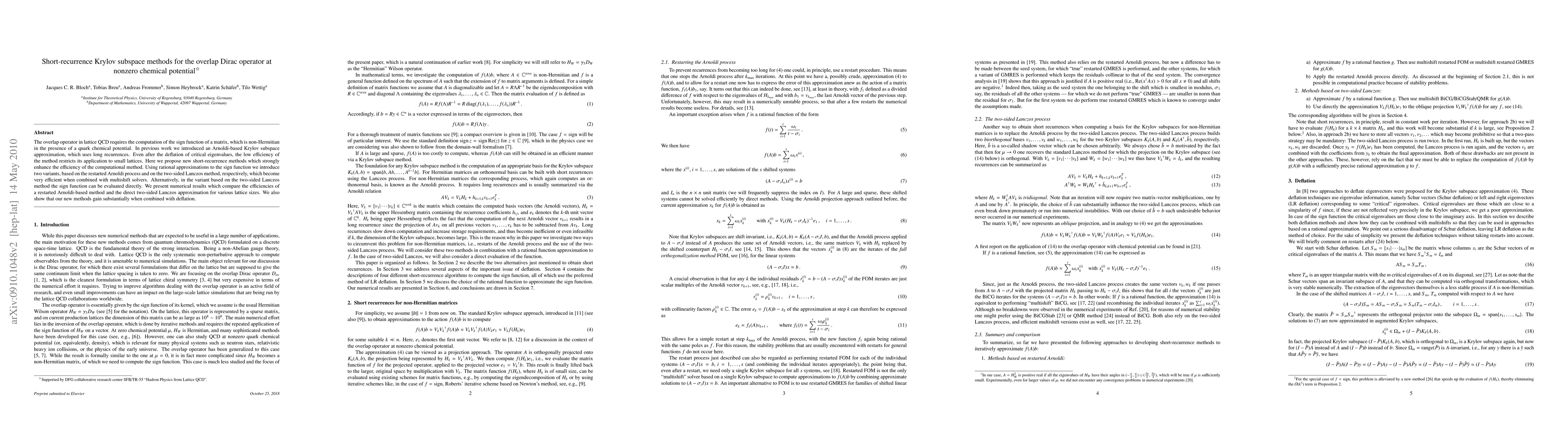 This paper proposes new short-recurrence Krylov subspace methods to efficiently compute the sign function of the overlap Dirac operator in lattice QCD at nonzero chemical potential, enhancing the efficiency of previous long-recurrence methods. The authors introduce two variants based on restarted Arnoldi and two-sided Lanczos, showing significant improvements when combined with deflation and multishift solvers.