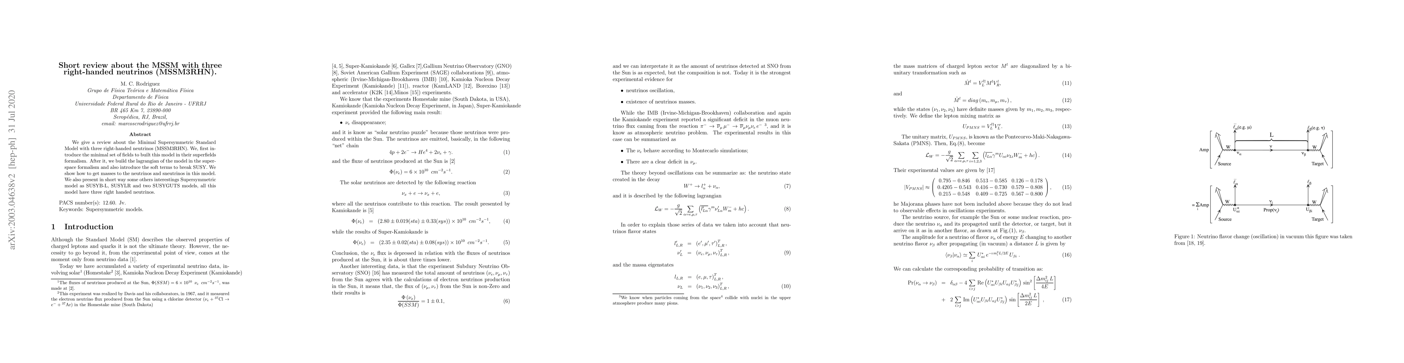 We give a review about the Minimal Supersymmetric Standard Model with three right-handed neutrinos (MSSM3RHN). We, first introduce the minimal set of fields to built this model in their superfields formalism. After it, we build the lagrangian of the model in the superspace formalism and also introduce the soft terms to break SUSY. We show how to get masses to the neutrinos and sneutrinos in this model.