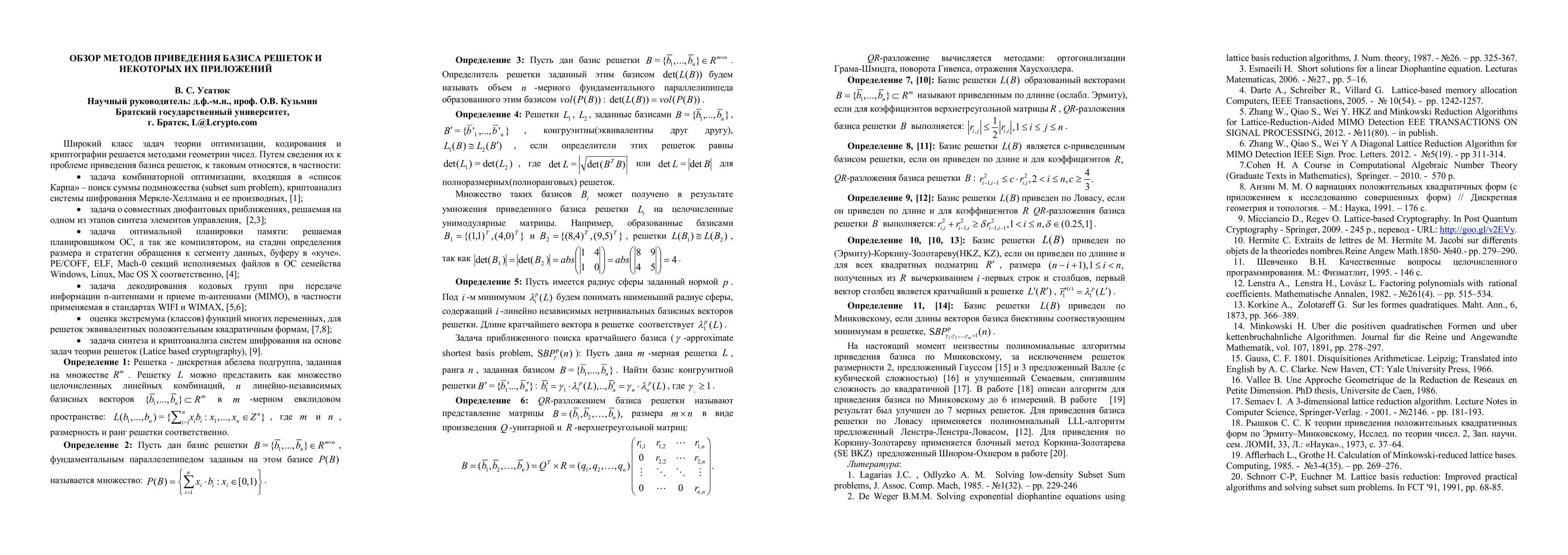 **Summary:** This article reviews five types of lattice basis reduction: size reduced, c-reduced, Lovasz condition, Hermit-Korkin-Zolotarev, and Minkowski reduced. It highlights applications in various fields including information theory, calculus, complexity theory, and cryptography.