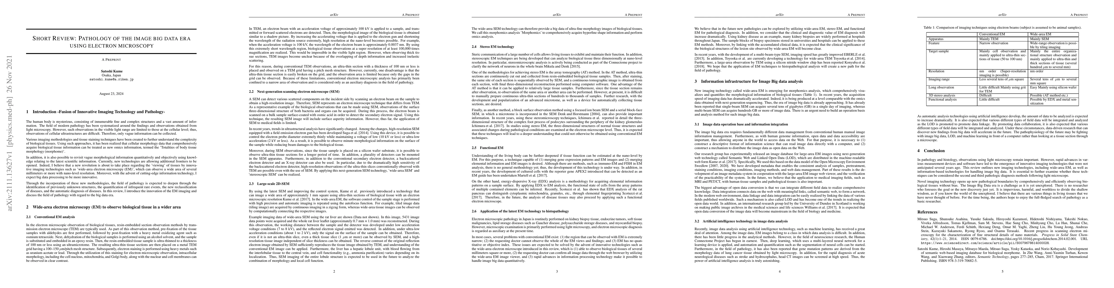 The human body is mysterious, consisting of innumerable fine and complex structures and a vast amount of information. The field of modern pathology has been systematized around the findings and observations obtained from light microscopy. However, such observations in the visible light range are limited to those at the cellular level; thus, observations of cellular ultrastructures are difficult. Therefore, only vague information can be collected. Various imaging methodologies and tissue staining techniques have been created to further understand the complexity of biological tissues. Using such approaches, it has been realized that cellular morphology data that comprehensively acquire biological tissue information can be treated as new omics information, termed the 'Totalities of body tissue morphology (morphome)'. In addition, it is also possible to revisit vague morphological information quantitatively and objectively using knowledge relating to the latest scientific information. Currently, new technologies are allowing additional frontiers to be opened. Indeed, I believe that a new revolution is about to take place regarding the 'viewing' of tissues by innovative imaging technologies such as 'wide-area electron microscopy (EM)', which can observe a wide area of several millimeters or more with nano-level resolution. Moreover, with the advent of cutting-edge information technology, I expect big data processing to be more innovative. Through the incorporation of these new methodologies, the field of pathology is expected to deepen through the identification of previously unknown structures, the quantification of infrequent rare events, the new reclassification of diseases, and the automatic diagnosis of diseases. In this review, I introduce the innovation of the EM imaging and discuss the field of pathology with regard to the big data era.
