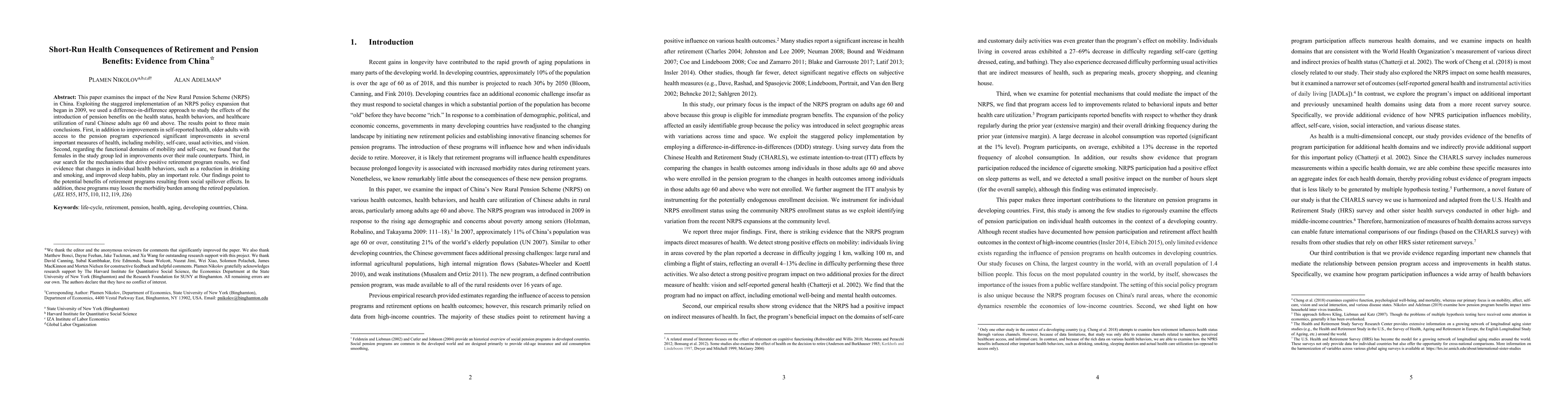 This study investigates the health impacts of China's New Rural Pension Scheme (NRPS), finding significant improvements in health status, behaviors, and healthcare utilization among rural retirees. Females showed greater improvements in mobility and self-care compared to males, and changes in health behaviors like reduced smoking and drinking contributed to the positive outcomes.