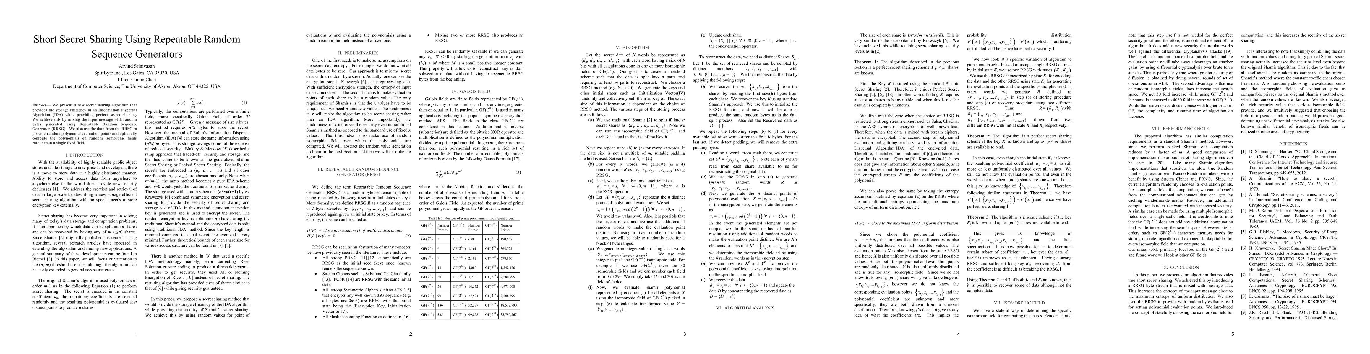 The paper introduces a new secret sharing algorithm that combines the storage efficiency of Information Dispersal Algorithms (IDA) with perfect secret sharing, achieved by mixing the input message with random bytes generated using Repeatable Random Sequence Generators (RRSG).