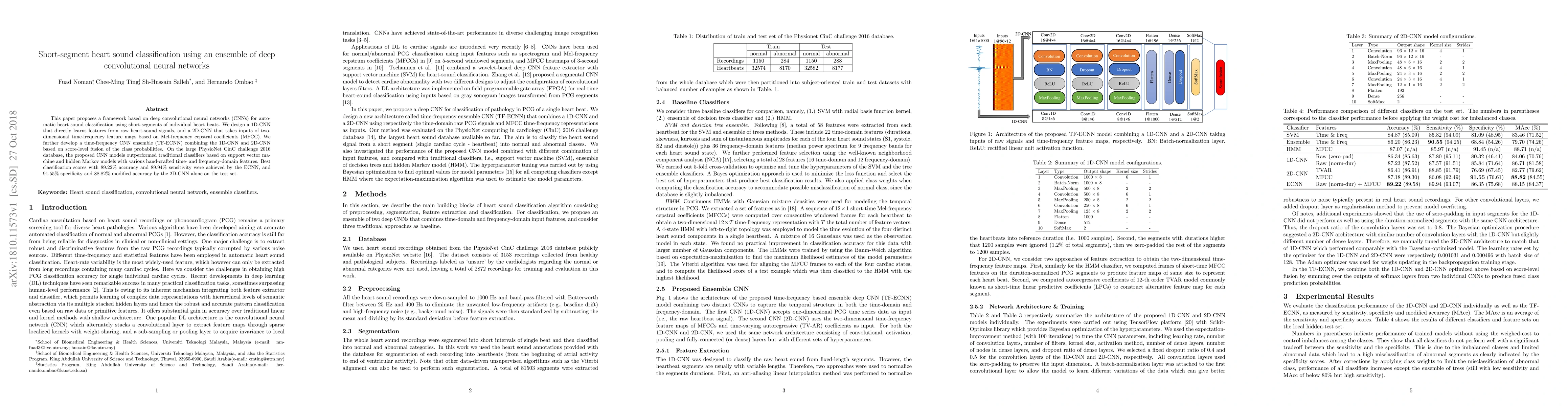 This paper presents a deep learning framework for automatic heart sound classification using short segments of heart beats, combining 1D and 2D CNNs in an ensemble model that outperforms traditional classifiers, achieving 89.22% accuracy and high sensitivity and specificity on the PhysioNet CinC challenge 2016 database.
