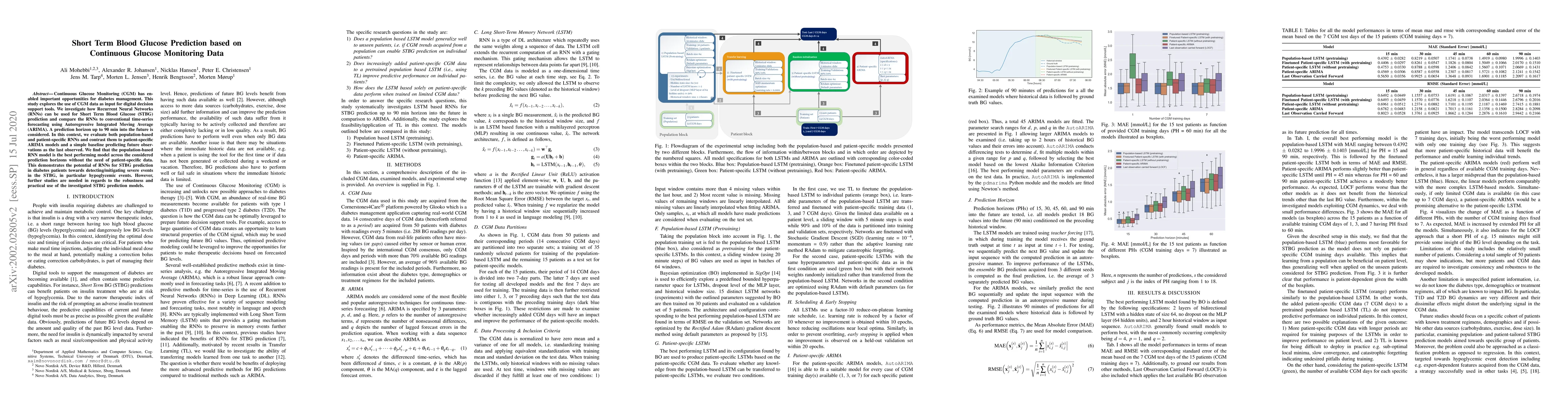 This study investigates the use of Recurrent Neural Networks (RNNs) for predicting short-term blood glucose levels using Continuous Glucose Monitoring data, finding that population-based RNNs outperform conventional ARIMA models and baseline methods, though further research is needed for practical application.