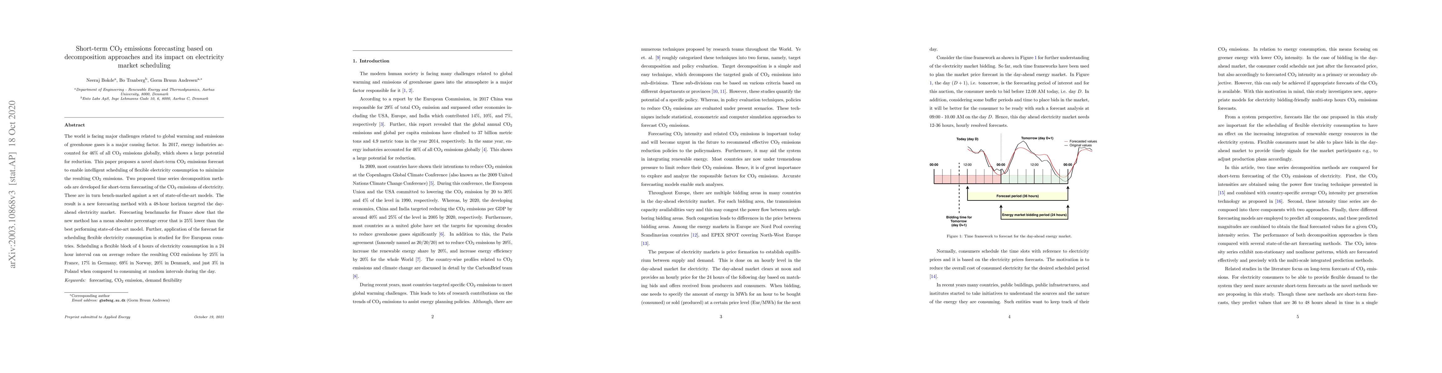 This paper introduces novel short-term CO2 emissions forecasting methods using time series decomposition, achieving a 25% lower mean absolute percentage error compared to state-of-the-art models. The forecasting is applied to optimize electricity market scheduling, reducing CO2 emissions by up to 69% in Norway and 25% in France when flexible electricity consumption is scheduled.