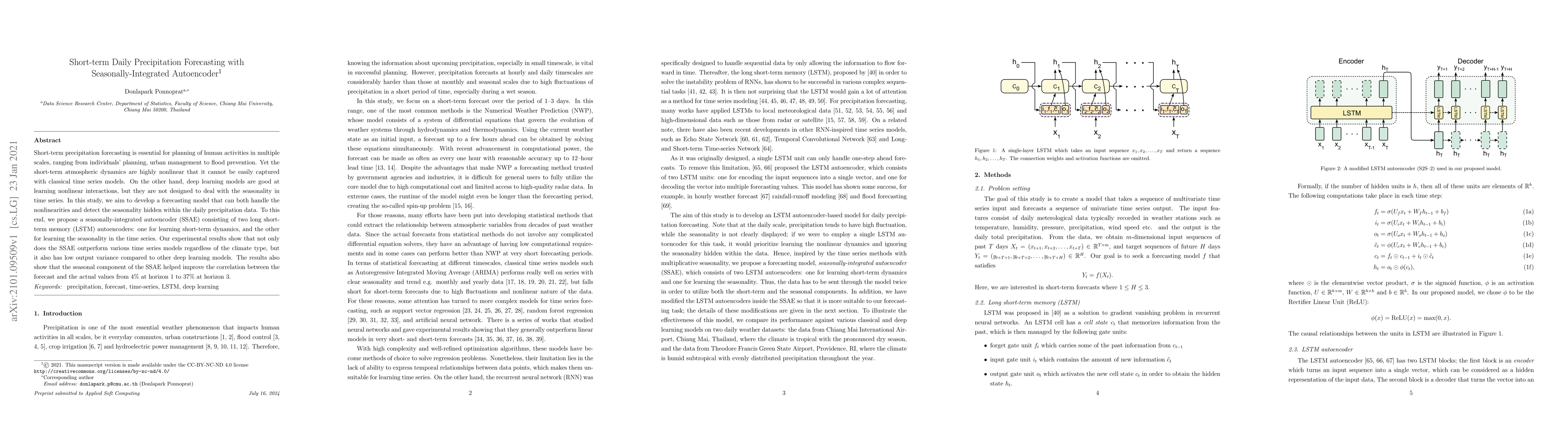 This study proposes a seasonally-integrated autoencoder (SSAE) with two LSTM autoencoders to forecast short-term daily precipitation, effectively handling both nonlinear dynamics and seasonality. Experimental results demonstrate superior performance over various time series models and improved forecast accuracy.