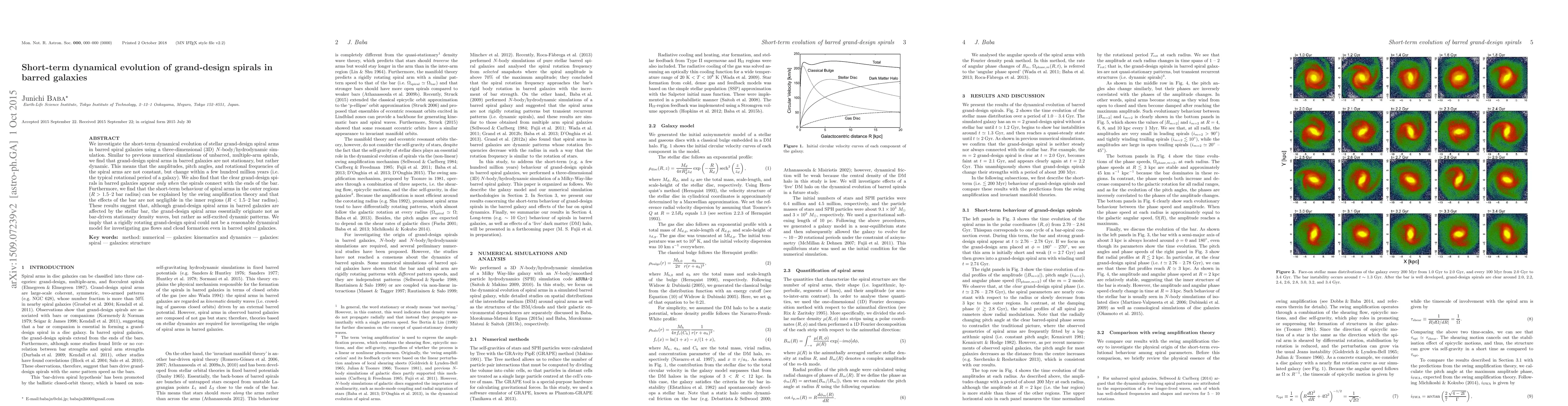 We investigate the short-term dynamical evolution of stellar grand-design spiral arms in barred spiral galaxies using a three-dimensional (3D) $N$-body/hydrodynamic simulation. Similar to previous numerical simulations of unbarred, multiple-arm spirals, we find that grand-design spiral arms in barred galaxies are not stationary, but rather dynamic. This means that the amplitudes, pitch angles, and rotational frequencies of the spiral arms are not constant, but change within a few hundred million years (i.e. the typical rotational period of a galaxy). We also find that the clear grand-design spirals in barred galaxies appear it only when the spirals connect with the ends of the bar. Furthermore, we find that the short-term behaviour of spiral arms in the outer regions ($R>$ 1.5--2 bar radius) can be explained by the swing amplification theory and that the effects of the bar are not negligible in the inner regions ($R<$ 1.5--2 bar radius). These results suggest that, although grand-design spiral arms in barred galaxies are affected by the stellar bar, the grand-design spiral arms essentially originate not as bar-driven stationary density waves, but rather as self-excited dynamic patterns. We imply that a rigidly rotating grand-design spiral could not be a reasonable dynamical model for investigating gas flows and cloud formation even in barred spiral galaxies.